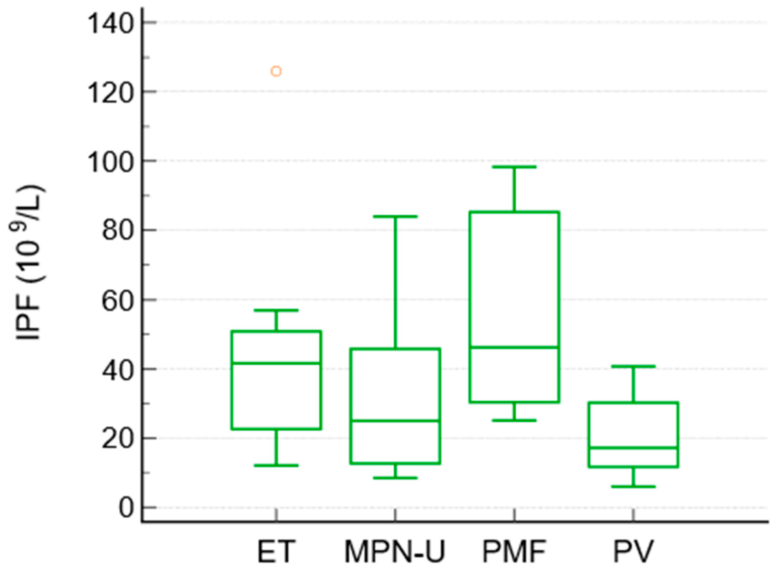 - Panova-Noeva, M.; Marchetti, M.; Buoro, S.; Russo, L.; Leuzzi, A.; Finazzi, G.; Rambaldi, A.; Ottomano, C.; Ten Cate, H.; Falanga, A. JAK2V617F mutation and hydroxyurea treatment as determinants of immature platelet parameters in essential thrombocythemia and polycythemia vera patients. Blood 2011, 118, 2599–2601. [Google Scholar] [CrossRef]