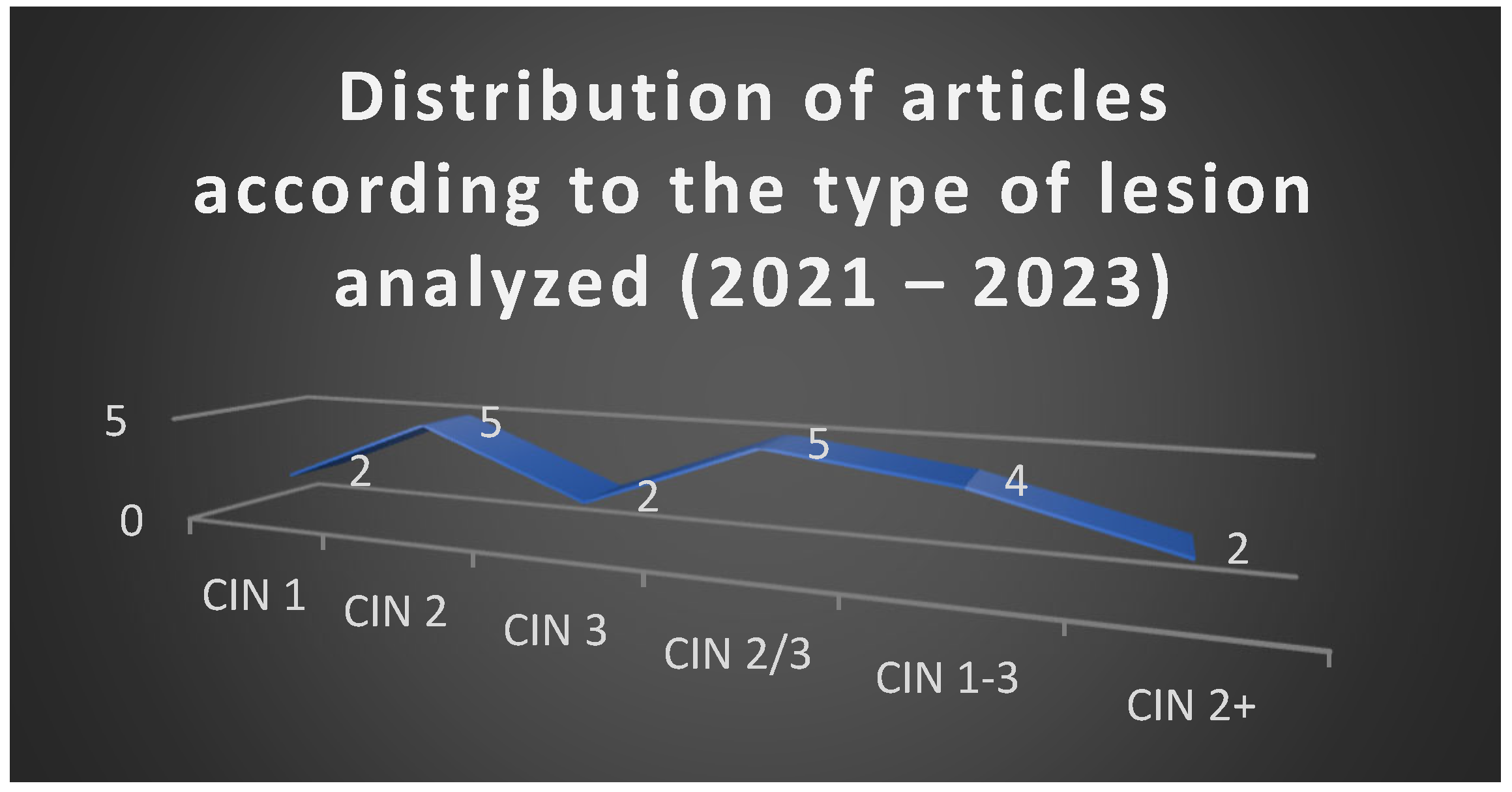 The analysis of the 20 selected articles published between 2021 and 2023 revealed a balanced representation of studies addressing different grades of cervical intraepithelial neoplasia, with a predominance of investigations on CIN 2 and CIN 2/3 lesions.