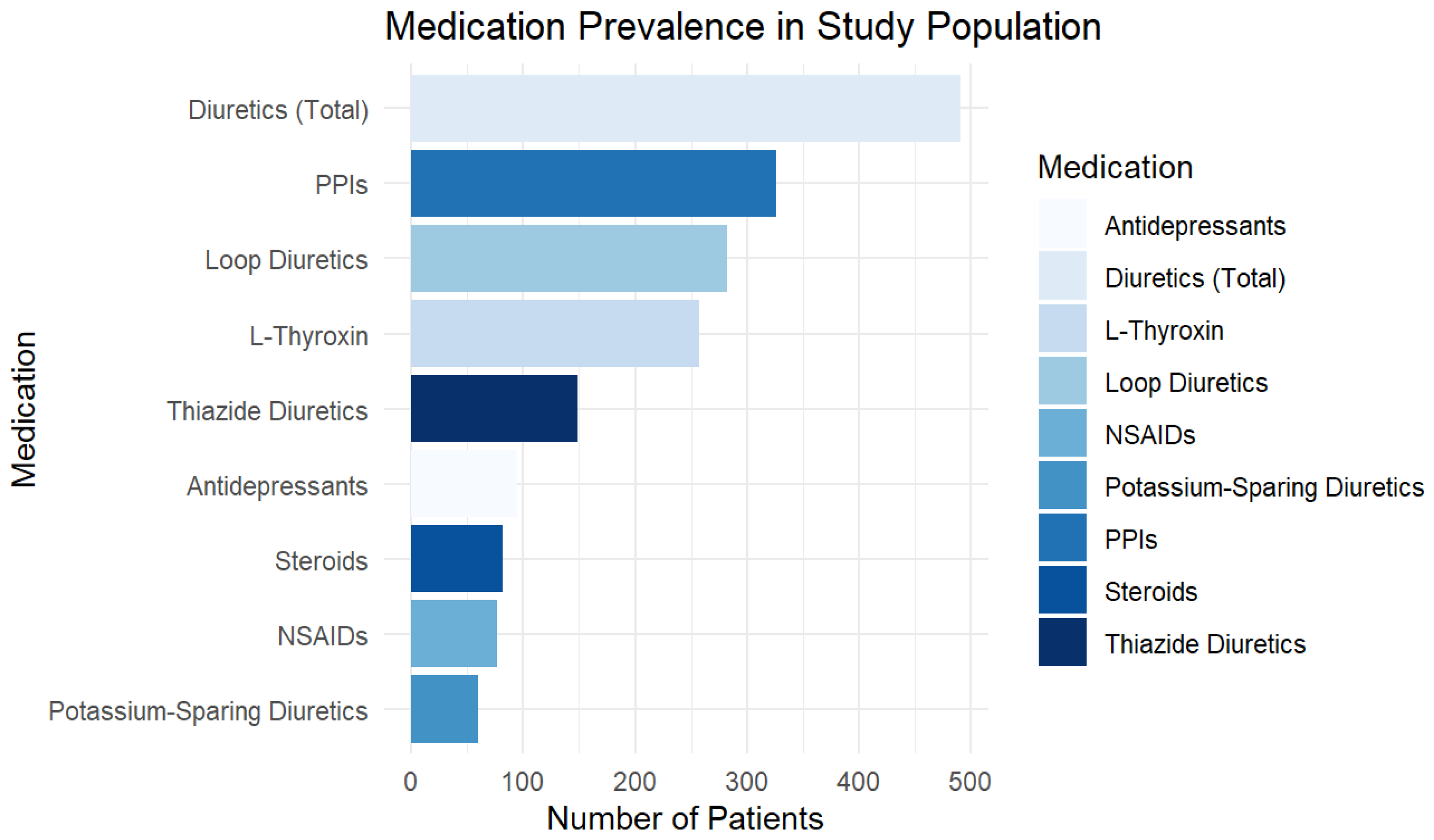 Figure 1 provides a graphical representation of medication prevalence, highlighting diuretics, PPIs, and thyroid medications as the most commonly used drug classes.