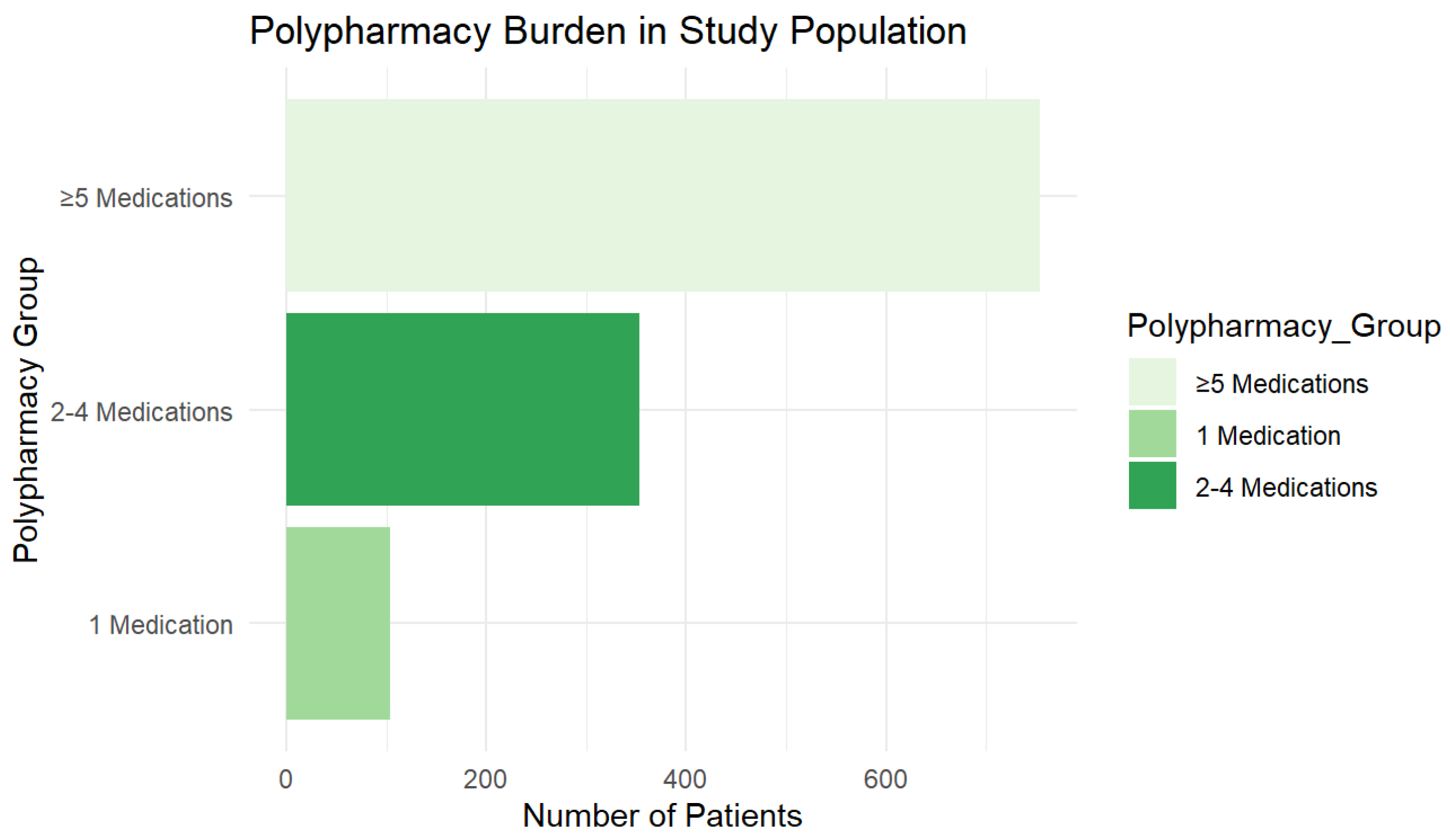 3]. Our threshold (≥5) reflects the advanced age and high multimorbidity burden of our cohort. This threshold was chosen in accordance with commonly used geriatric definitions of polypharmacy and is widely applied in studies involving older and multimorbid populations. A cut-off of ≥5 medications remains the most frequently used and clinically relevant threshold in geriatric research, particularly in very old inpatient cohort [