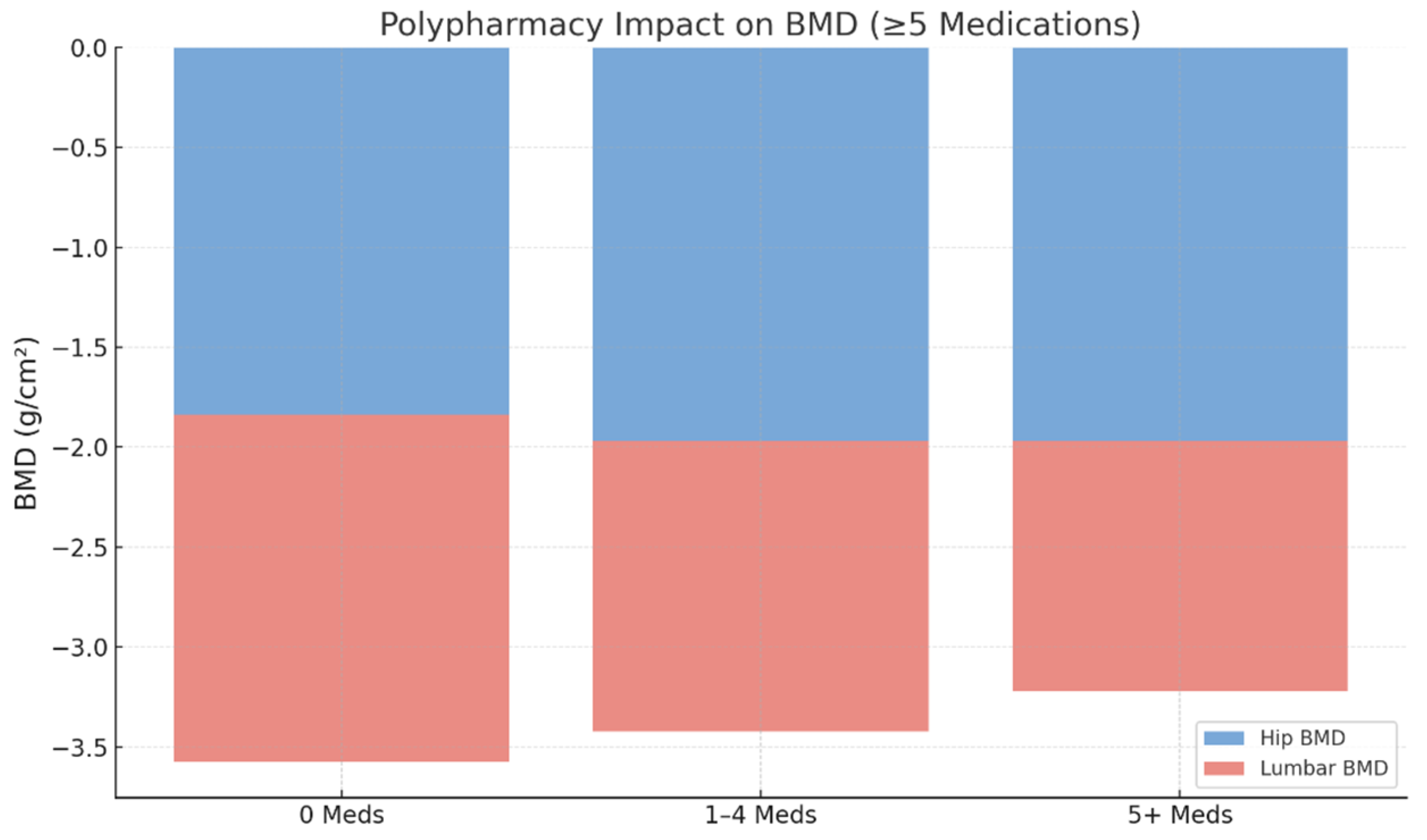 Table 1. Previous studies have consistently linked polypharmacy with an elevated risk of osteoporotic fractures, particularly hip fractures, in community-dwelling older adults and post-fracture populations. Large cohort and claims-based studies have shown that fracture risk increases progressively with the number of prescribed medications, even after adjusting for comorbidity and functional status. Taken together with our findings, the disproportionately stronger association of polypharmacy with lumbar BMD supports the hypothesis that cumulative medication exposure may be preferentially linked to lower trabecular bone density—an area with higher turnover and greater sensitivity to pharmacologic disruptions. This mechanism may partly explain the high vertebral fracture burden observed in multimorbid geriatric patients despite comparable hip BMD [
