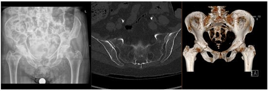 Fragility fractures of the pelvis (FFPs) are increasingly prevalent worldwide, given the ageing population and increasing incidence of osteoporosis, which predisposes patients to sustaining these injuries with only minor trauma, or with physiological load in the absence of known trauma [1,2,3]. In the latter case, they are often referred to as insufficiency fractures, typically of the sacrum. Patients who sustain these fractures often have significant co-morbidities, which significantly increase the risks of surgical intervention [4,5]. The majority of FFPs (Figure 1 and Figure 2) are managed conservatively with analgesia and progressive mobilisation [6], but they also confer a significant health and social care burden and increased mortality risk [7,8], particularly if weight-bearing is restricted. Surgical treatment is reserved for displaced FFPs, those with clear features of mechanical instability, or following failure of non-operative treatment (primarily due to pain) [9,10,11,12].