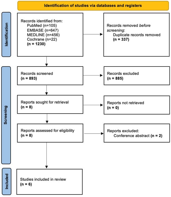 The search process is shown in the PRISMA flowchart (Figure 3). A combined search of the PubMed, EMBASE, MEDLINE, and Cochrane databases yielded 1230 articles; after eliminating duplicates, 893 remained.