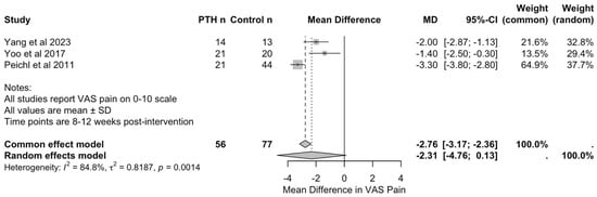 Three studies, with a total of 56 patients in PTH groups and 77 in control groups, reported VAS pain scores at 8 to 12 weeks post-intervention, enabling quantitative synthesis [26,37,38]. Yang et al. [37] assessed outcomes at 12 weeks comparing PTH with sacroplasty, whilst Yoo et al. [38] and Peichl et al. [26] evaluated outcomes at 8 weeks comparing PTH with conservative management.
