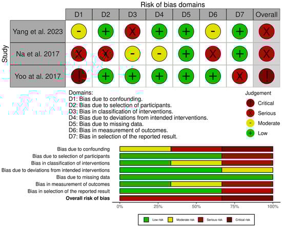 The included studies were assessed for their quality and risk of bias using the RoB 2 tool, the ROBINS-I tool (Figure 5 and Figure 6), and the JBI critical appraisal checklist for case series (for single-arm studies) [31,32,33]. Assessment across the domains (confounding, selection of participants, classification of interventions, deviations from intended interventions, missing data, measurement of outcomes, and selection of the reported result) indicated that none of the studies were judged to be at overall low risk of bias. Of the non-randomised comparative studies, all were at overall risk of serious or critical bias.