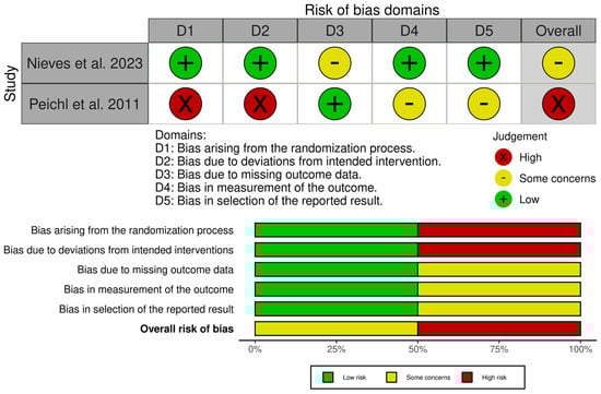 - McGuinness, L.A.; Higgins, J.P.T. Risk-of-Bias VISualization (robvis): An R Package and Shiny Web App for Visualizing Risk-of-Bias Assessments. Res. Synth. Methods 2021, 12, 55–61. [Google Scholar] [CrossRef]
