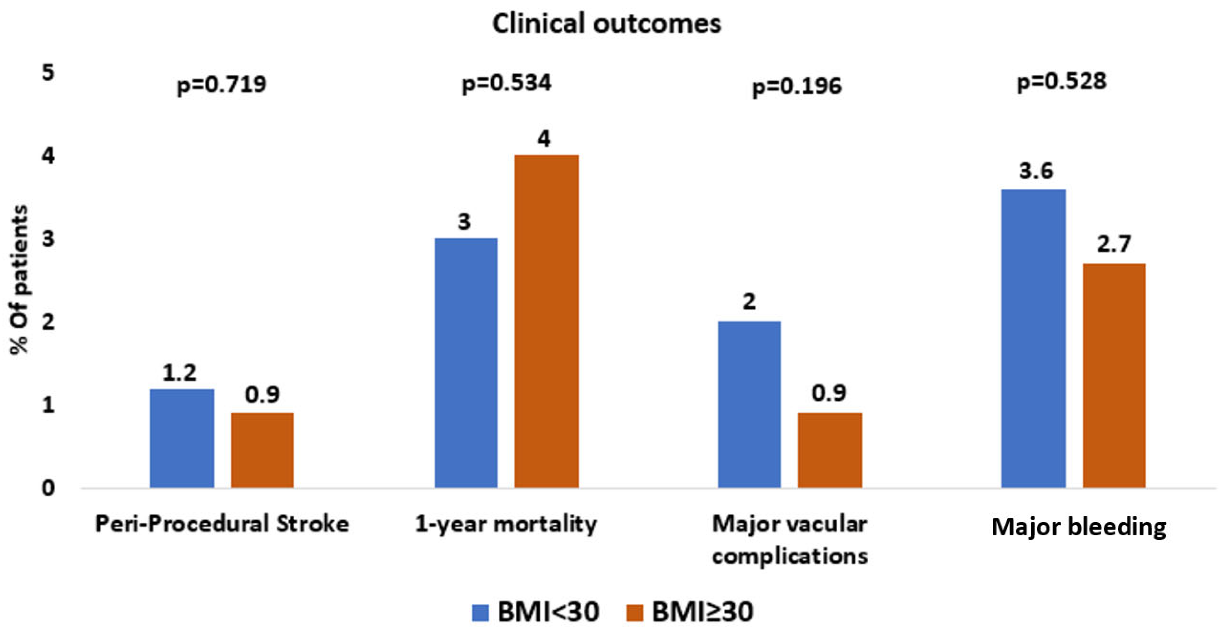 Figure 2. In the overall population of 1045 patients undergoing TAVR, procedural and clinical outcomes were favorable, with a device success rate of 92%, a low incidence of peri-procedural stroke (1.1%), low in-hospital mortality (0.4%), and a 1-year mortality rate of 3%. Major vascular complications were observed in 2% of patients, life-threatening bleeding in 1%, and major bleeding events in 3.4%. Coronary obstruction and peri-procedural myocardial infarction were rare, occurring in only 0.2% and 0.4% of patients, respectively. When outcomes were analyzed according to BMI, device success rates remained high and comparable between obese and non-obese patients (93% vs. 92%). The incidence of peri-procedural stroke did not differ significantly between the two groups (0.9% vs. 1.2%,