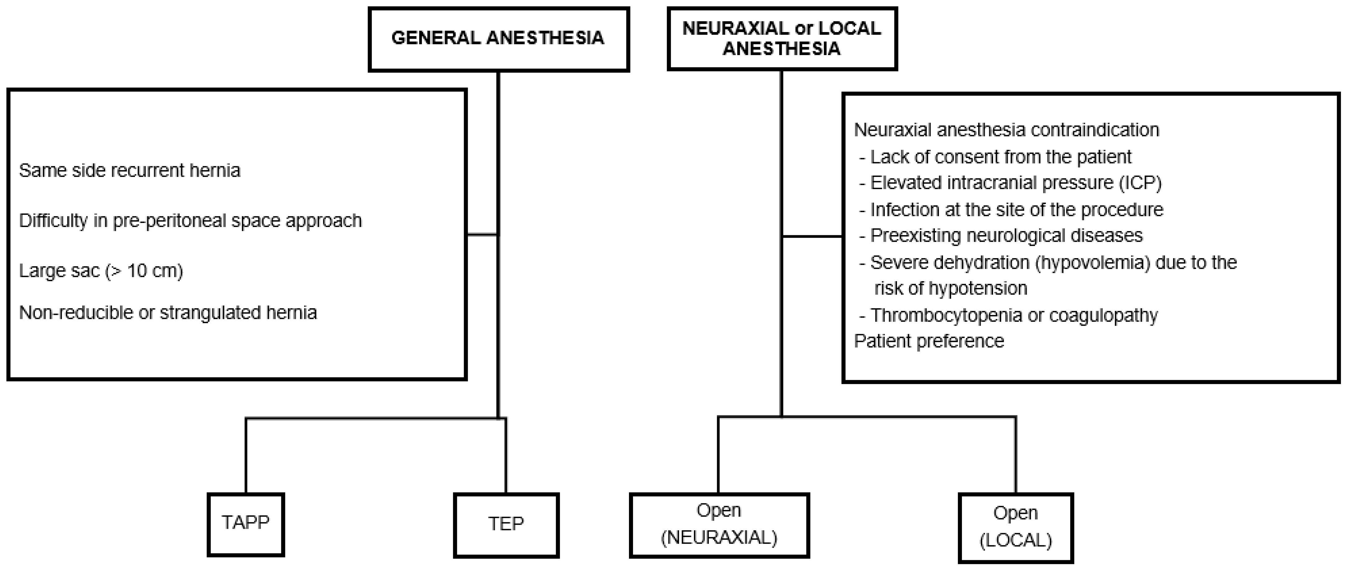 - Gass, M.; Banz, V.M.; Rosella, L.; Adamina, M.; Candinas, D.; Güller, U. TAPP or TEP? Population-based analysis of prospective data on 4,552 patients undergoing endoscopic inguinal hernia repair. World J. Surg. 2012, 36, 2782–2786. [Google Scholar] [CrossRef] [PubMed]