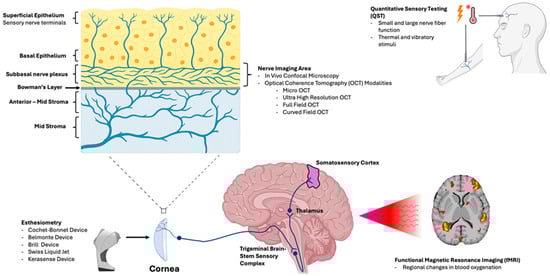 Illustration linking each modality to the anatomic level evaluated. In vivo confocal microscopy (IVCM) and optical coherence tomography (OCT)-based approaches assess corneal nerve structure and morphology, particularly within the subbasal nerve plexus (SNP). Corneal esthesiometry and quantitative sensory testing (QST) quantify sensory thresholds and peripheral somatosensory function. Central sensory processing is evaluated along the trigeminal pathway (brainstem to thalamus and somatosensory cortex), using functional magnetic resonance imaging (fMRI), to characterize pain-related neural activation.