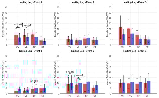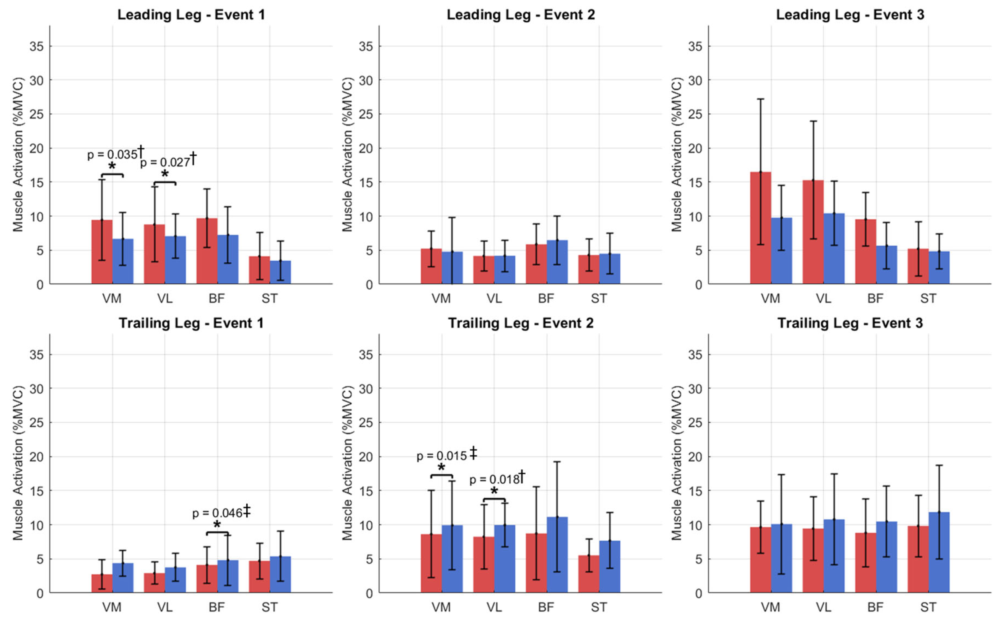 Figure 2. Comparison of muscle activation patterns for quadriceps (VM, VL) and hamstrings (BF, ST) in leading and trailing limbs between affected (red) and contralateral (blue) sides during step-up events (Event 1: initial stance; Event 2: box contact; Event 3: ascent completion). Significant differences (p < 0.05) were observed between affected and contralateral limbs across Events 1–3 (* = significant difference). Effect sizes: ‡ = small-to-medium; † = medium effect size.