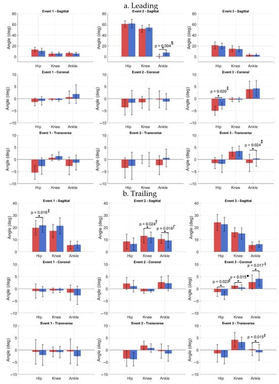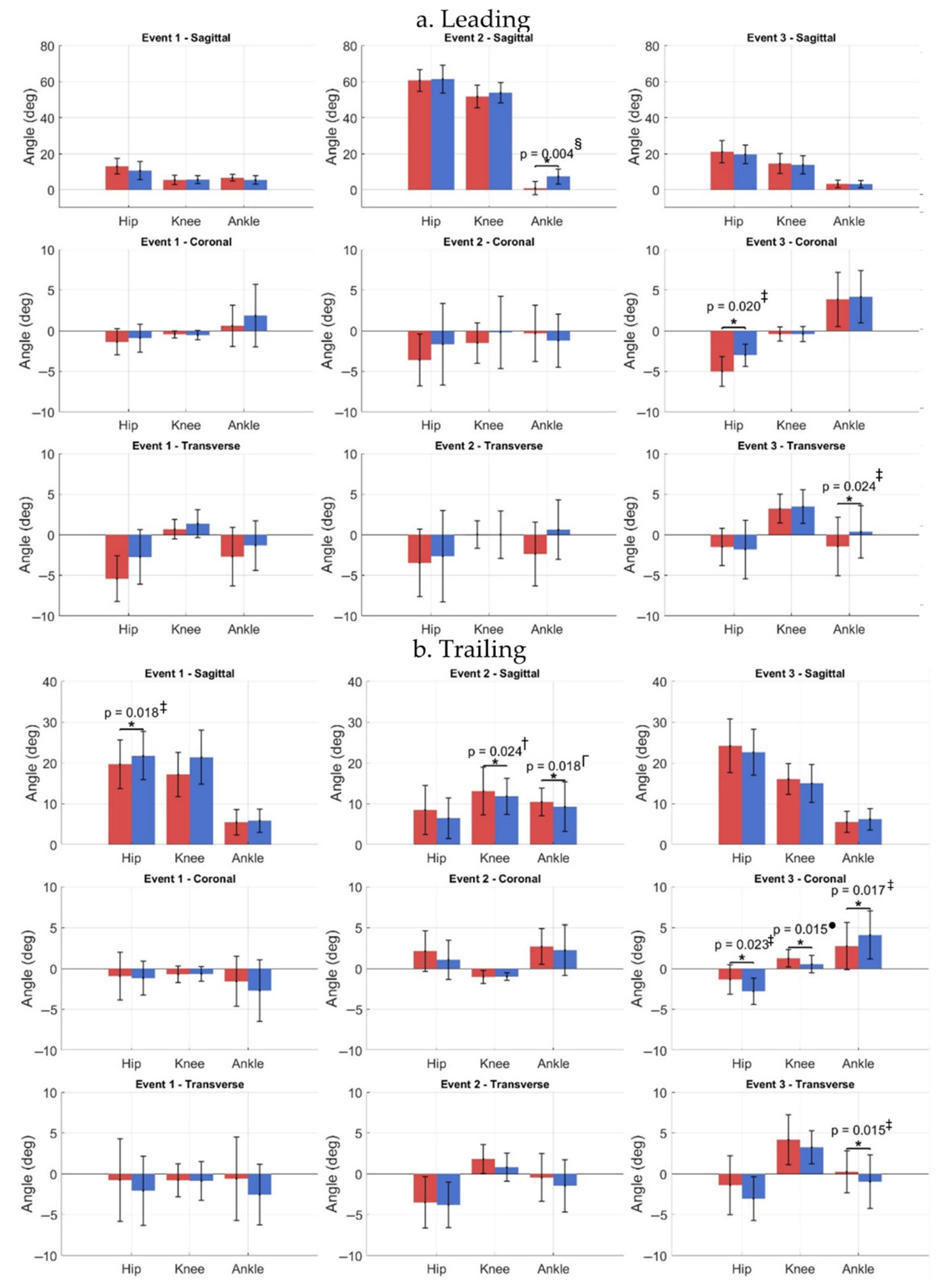 Figure 4. Comparison of hip, knee, and ankle joint angles for leading (a) and trailing (b) limbs between affected (red) and contralateral (blue) sides during step-up events (Event 1: initial stance; Event 2: box contact; Event 3: ascent completion). Significant differences (p < 0.05) were observed between affected and contralateral limbs across Events 1–3 (* = significant difference). Effect sizes: ● = small; ‡ = small-to-medium; † = medium; Γ = medium-to-large; § = large.
