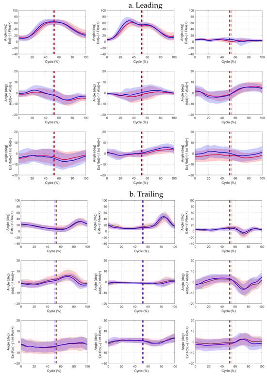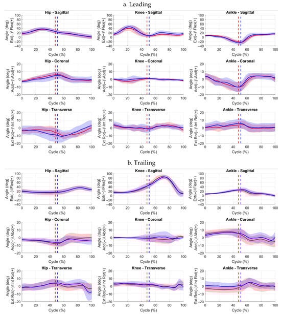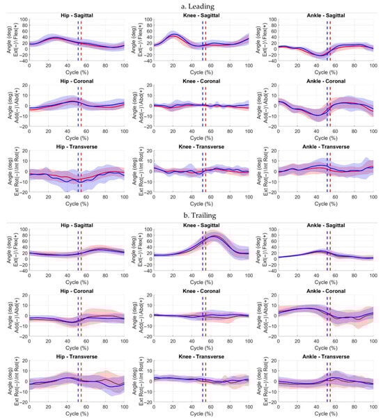 Figure 5. Hip, knee, and ankle joint angle waveforms (mean ± SD) for leading (a) and trailing (b) limbs across the full step-up cycle. Solid red line = affected limb mean; solid blue line = contralateral limb mean. Red and blue shaded areas represent ±1 SD deviation around the respective mean. Event 1 (initial stance) occurs at 0%. Event 2 (box contact) is indicated by dotted lines (red = affected, blue = contralateral). Event 3 (ascent completion) occurs at 100%.