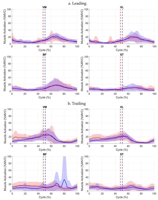 Figure 3. Muscle activation waveforms (mean ± SD) for leading (a) and trailing limbs (b) across the full step-up cycle. Solid red line = affected limb mean; solid blue line = contralateral limb mean. Red and blue shaded areas represent ±1 SD around the respective mean. Event 1 (initial stance) occurs at 0%. Event 2 (box contact) is indicated by dotted lines (red = affected, blue = contralateral). Event 3 (ascent completion) occurs at 100%.