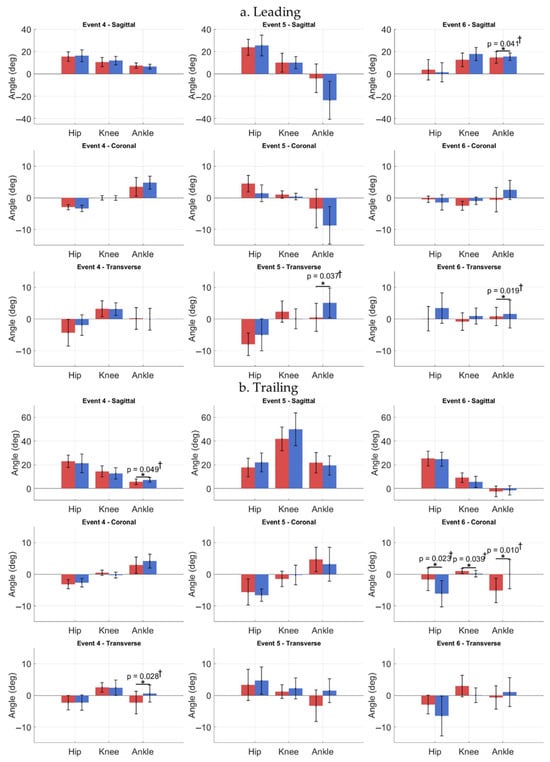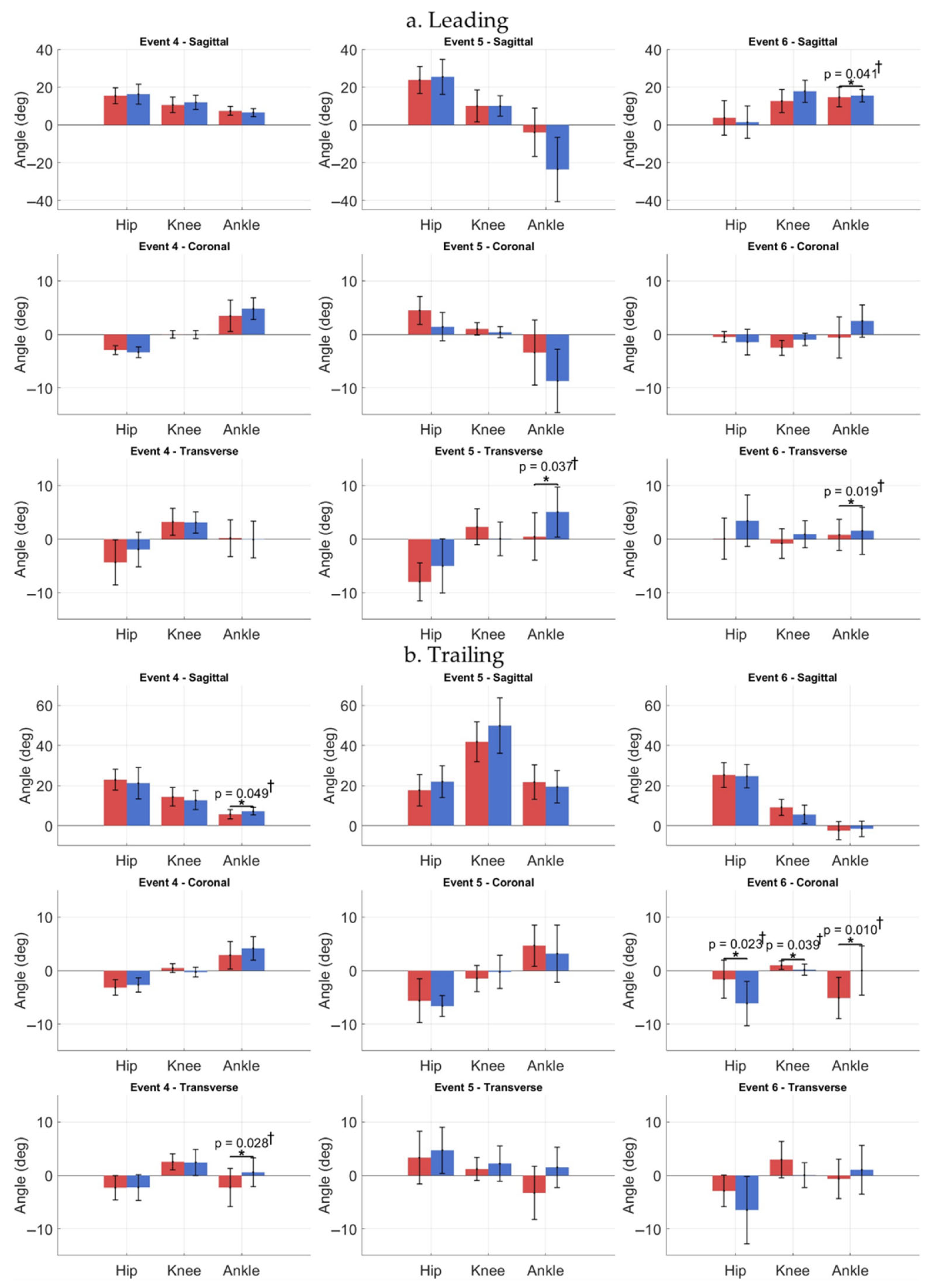 Figure 10. Comparison of hip, knee, and ankle joint angles for leading (a) and trailing limbs (b) between affected (red) and contralateral (blue) sides during full step-down (when step-up leading limb was contralateral) cycle. Solid red line = affected limb; solid blue line = contralateral limb. Event 4 (descent initiation) occurs at 0%. Event 5 (leading-leg touchdown) is indicated by dotted lines. Significant differences (p < 0.05) observed between affected and contralateral limbs across Events 1–3 (* = significant difference). Effect sizes: † = medium.