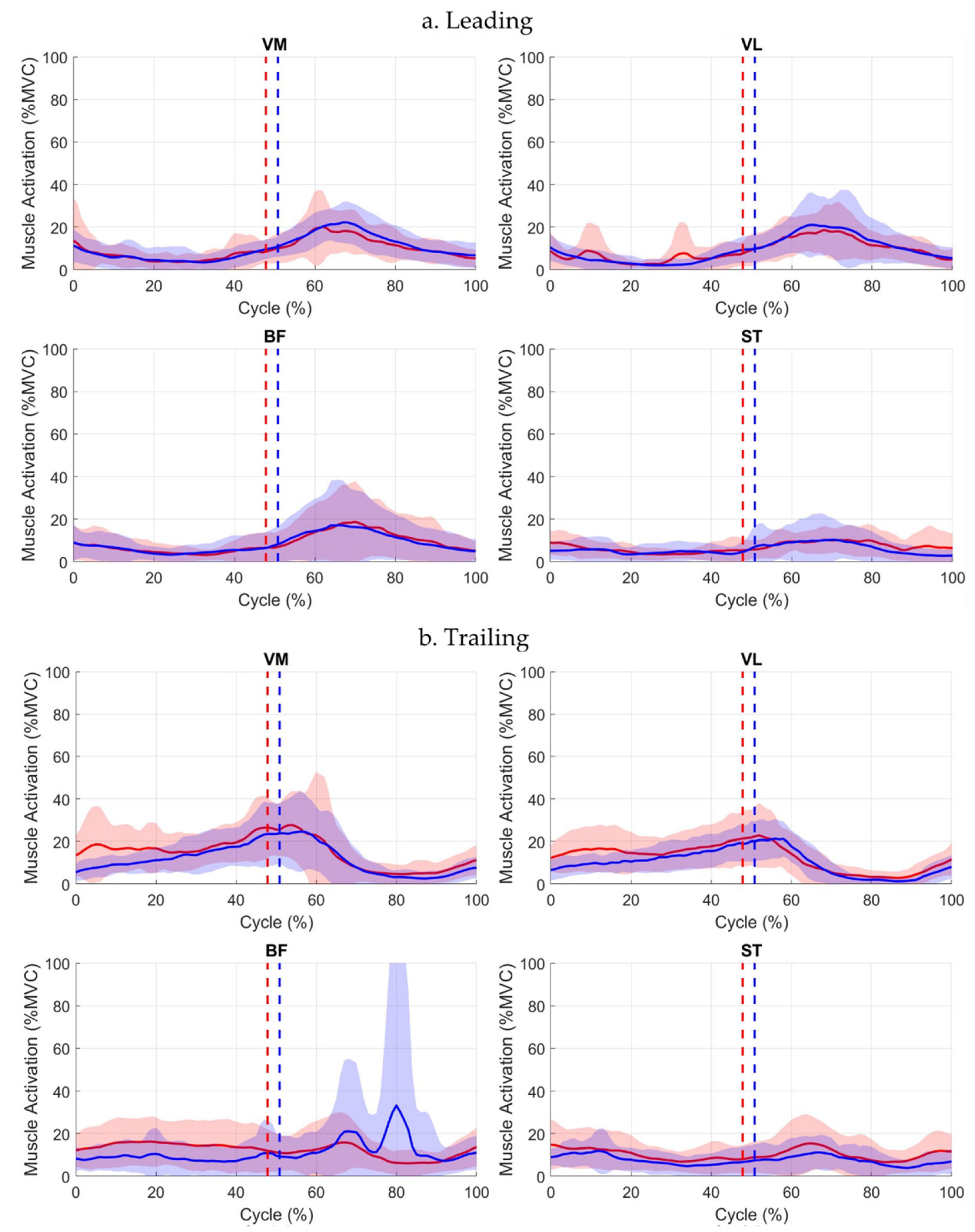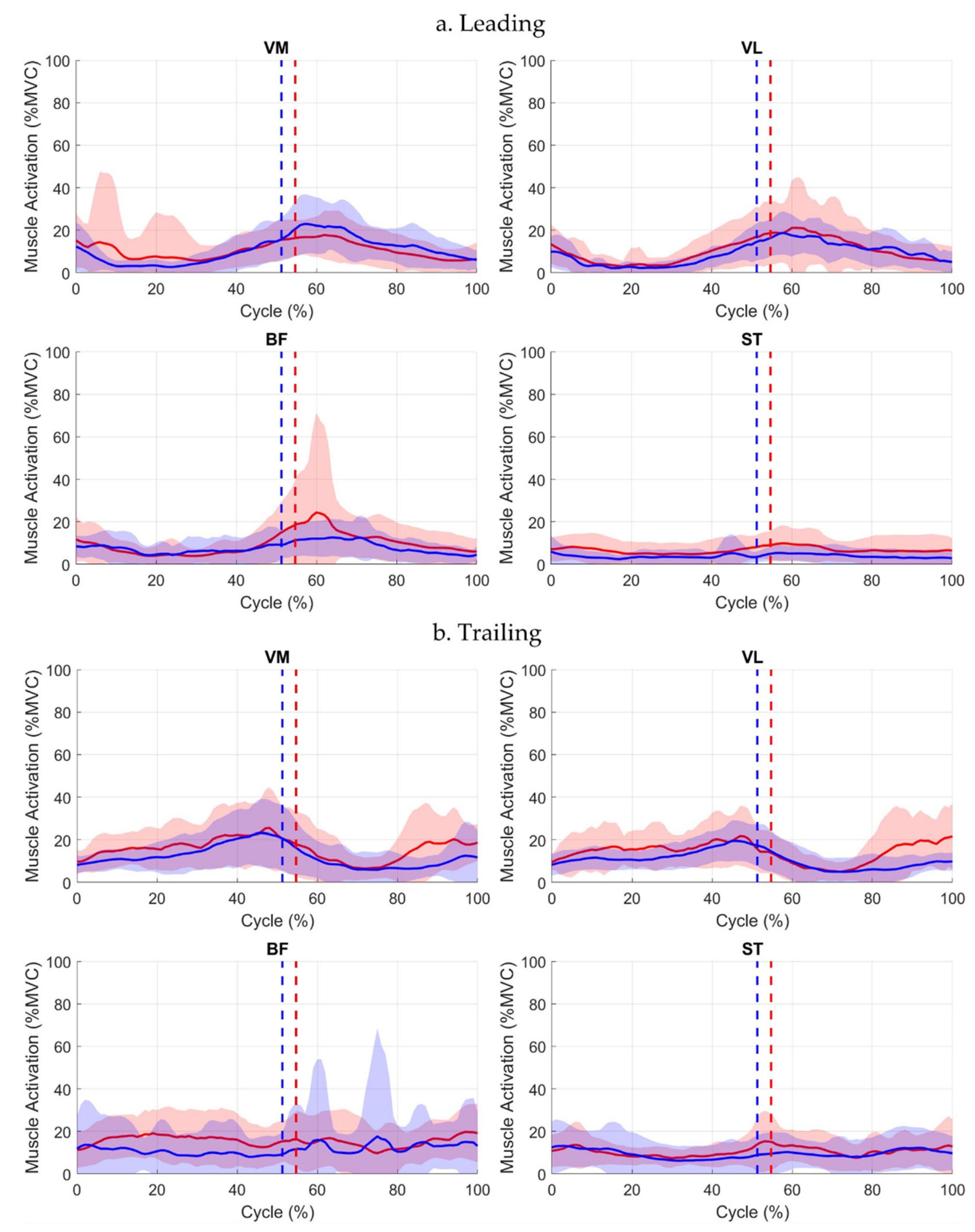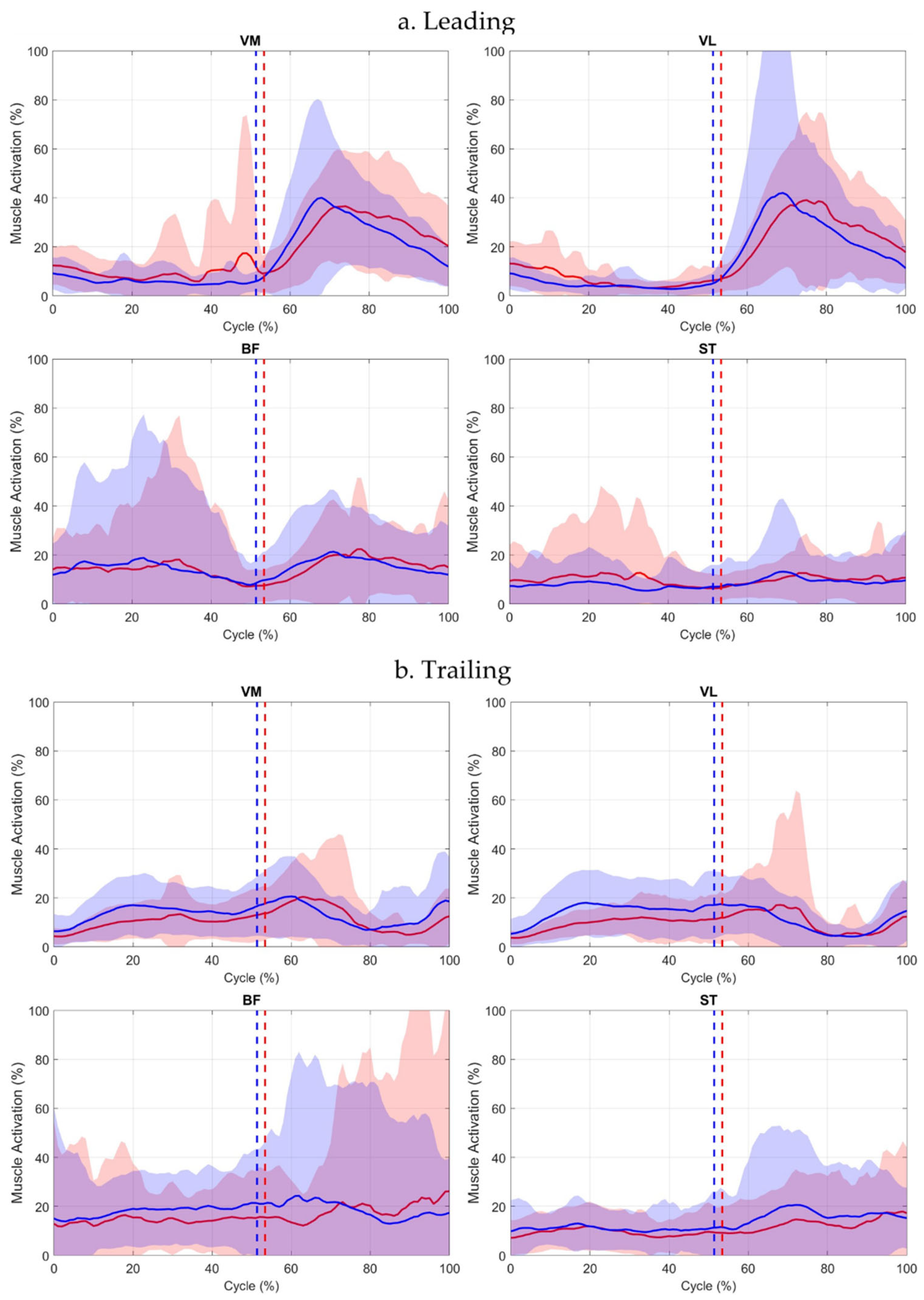 Waveform inspection indicated notable variability across participants, particularly in BF, and higher VM and ST variability in the affected leading limb between Events 1–2 (Figure 3).