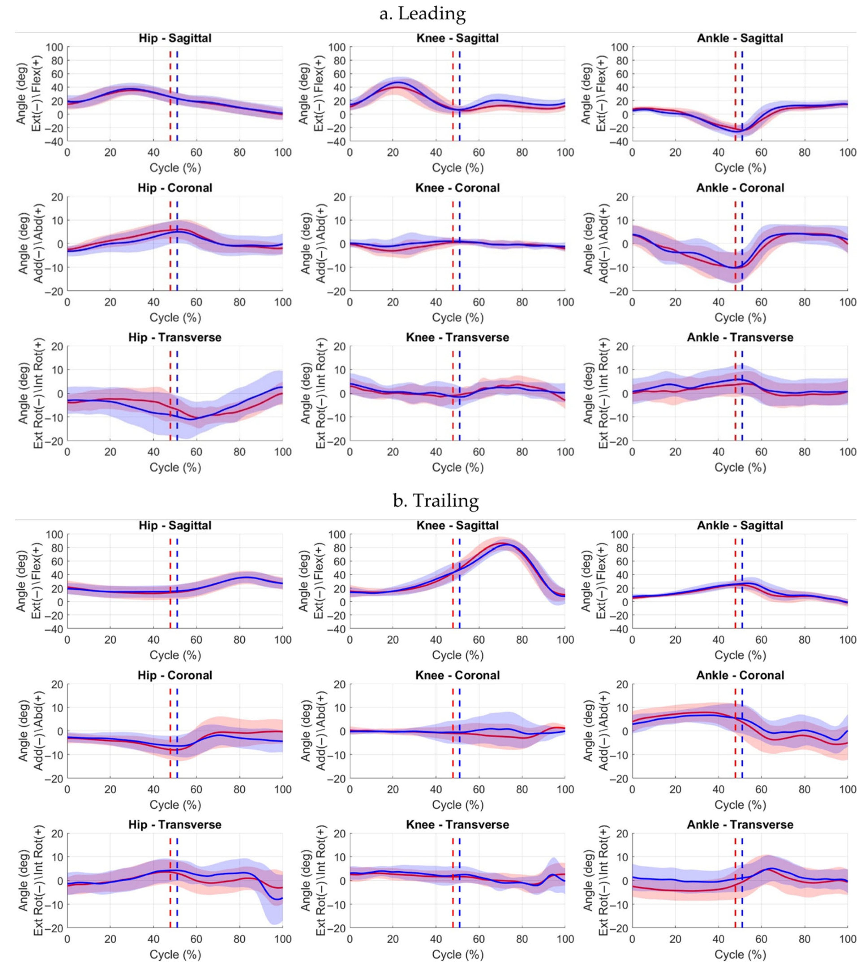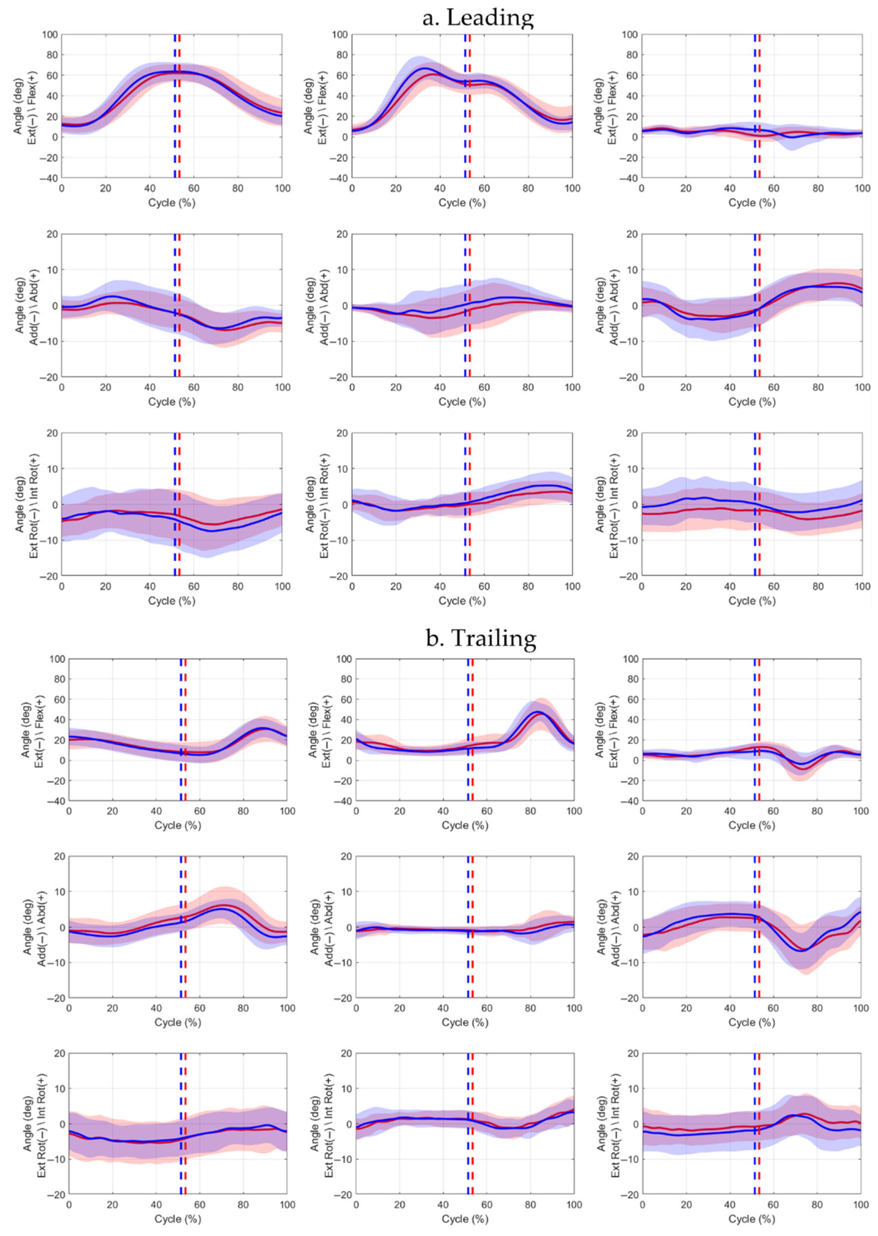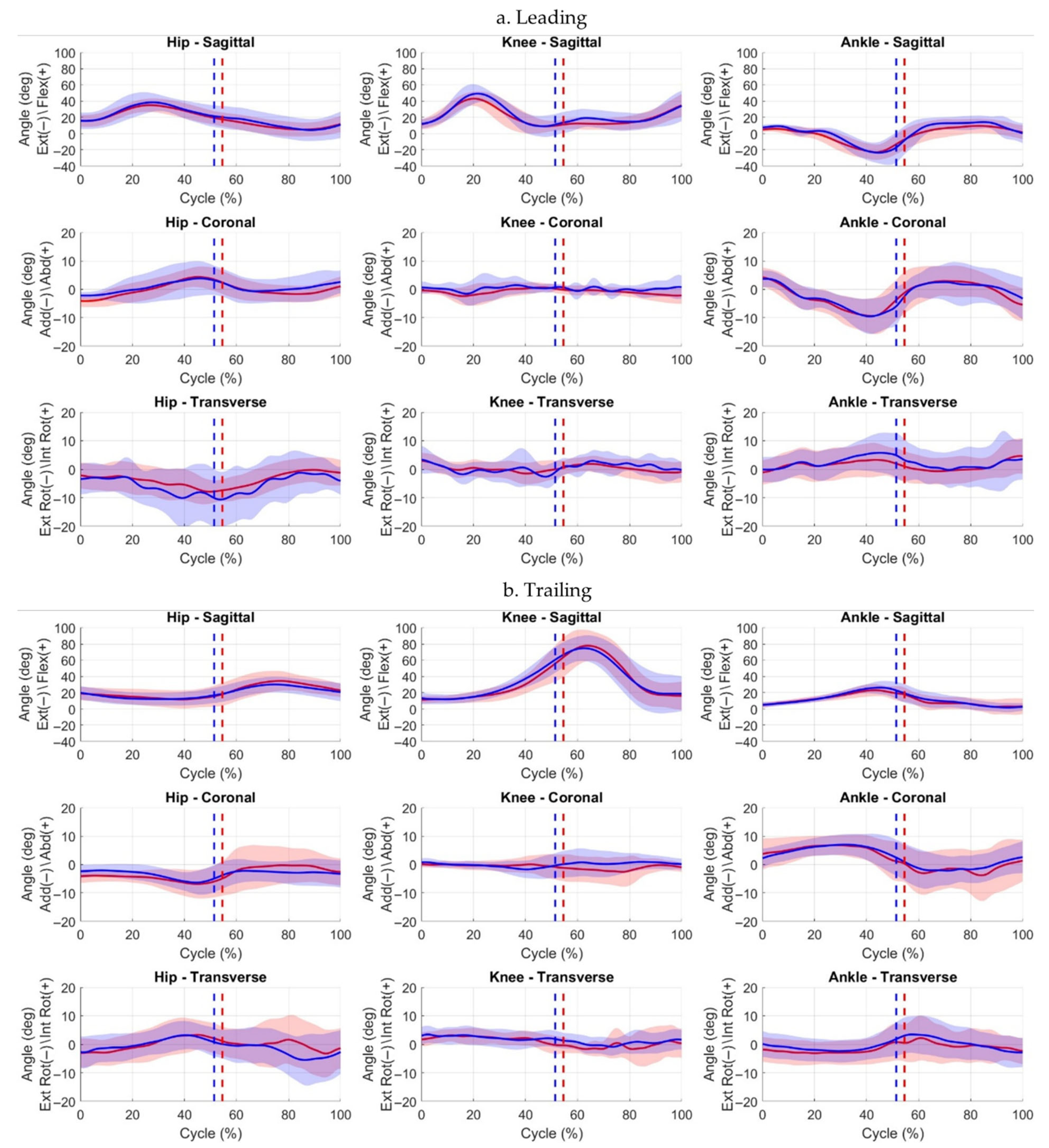 Figure 7. Hip, knee, and ankle joint angle waveforms (mean ± SD) for leading (a) and trailing (b) limbs across the full step-down (when step-up leading limb was affected) cycle. Solid red line = affected limb mean; solid blue line = contralateral limb mean. Red and blue shaded areas represent ±1 SD deviation around the respective mean. Event 4 (descent initiation) occurs at 0%. Event 5 (leading-leg touchdown) is indicated by dotted lines (red = affected, blue = contralateral). Event 6 (descent completion) occurs at 100%.