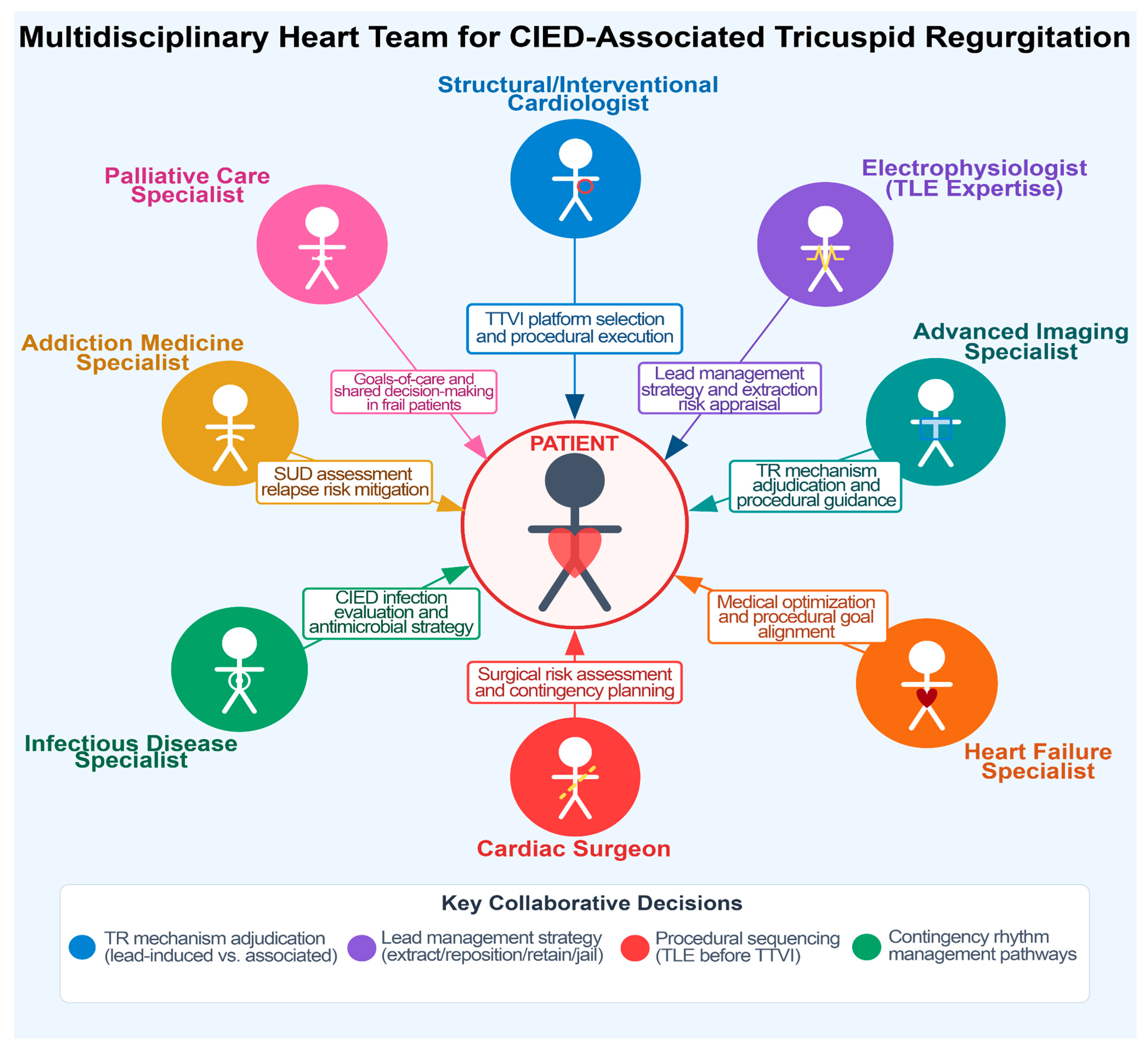 | Structural/Interventional Cardiologist | Procedural candidacy assessment integrating anatomic suitability, frailty, and expected clinical benefit; TTVI platform selection (repair vs. replacement; annuloplasty vs. leaflet-based); procedural execution | Co-ownership of lead-management strategy with EP to minimize lead-related procedural hazards; intraprocedural troubleshooting; preservation of downstream rhythm-management options |