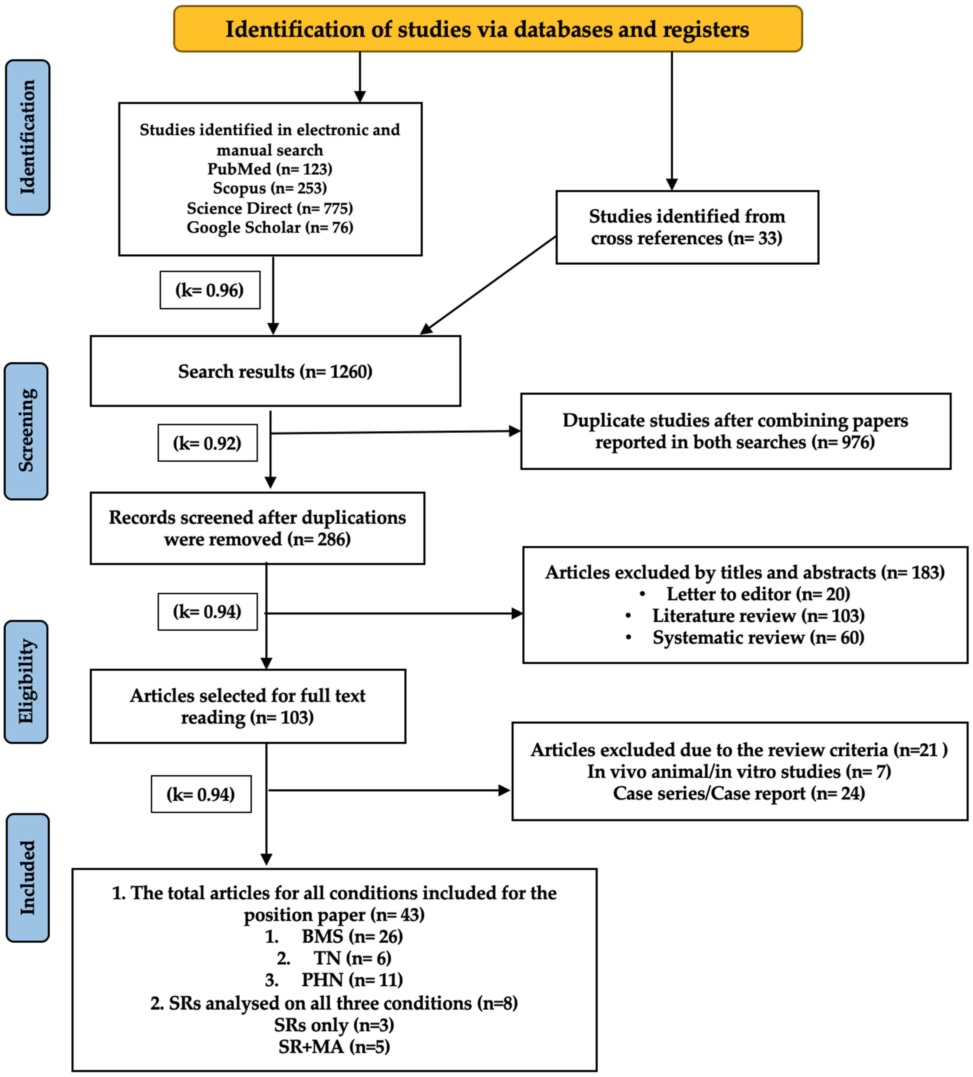 “Orofacial neuropathic pain” OR “neuropathic orofacial pain” OR “trigeminal neuralgia” OR “idiopathic trigeminal neuralgia” OR “primary burning mouth syndrome” OR “post-traumatic trigeminal neuropathy” OR “trigeminal nerve injury” OR “BMS” OR “PHN” OR “post-herpetic neuralgia”, OR “glossopharyngeal neuralgia” OR “neuropathic pain” OR “occipital neuralgia” OR “Burning sensation” OR “BMS” OR “GPN” OR “ON” OR “PTTN” OR “TN”.