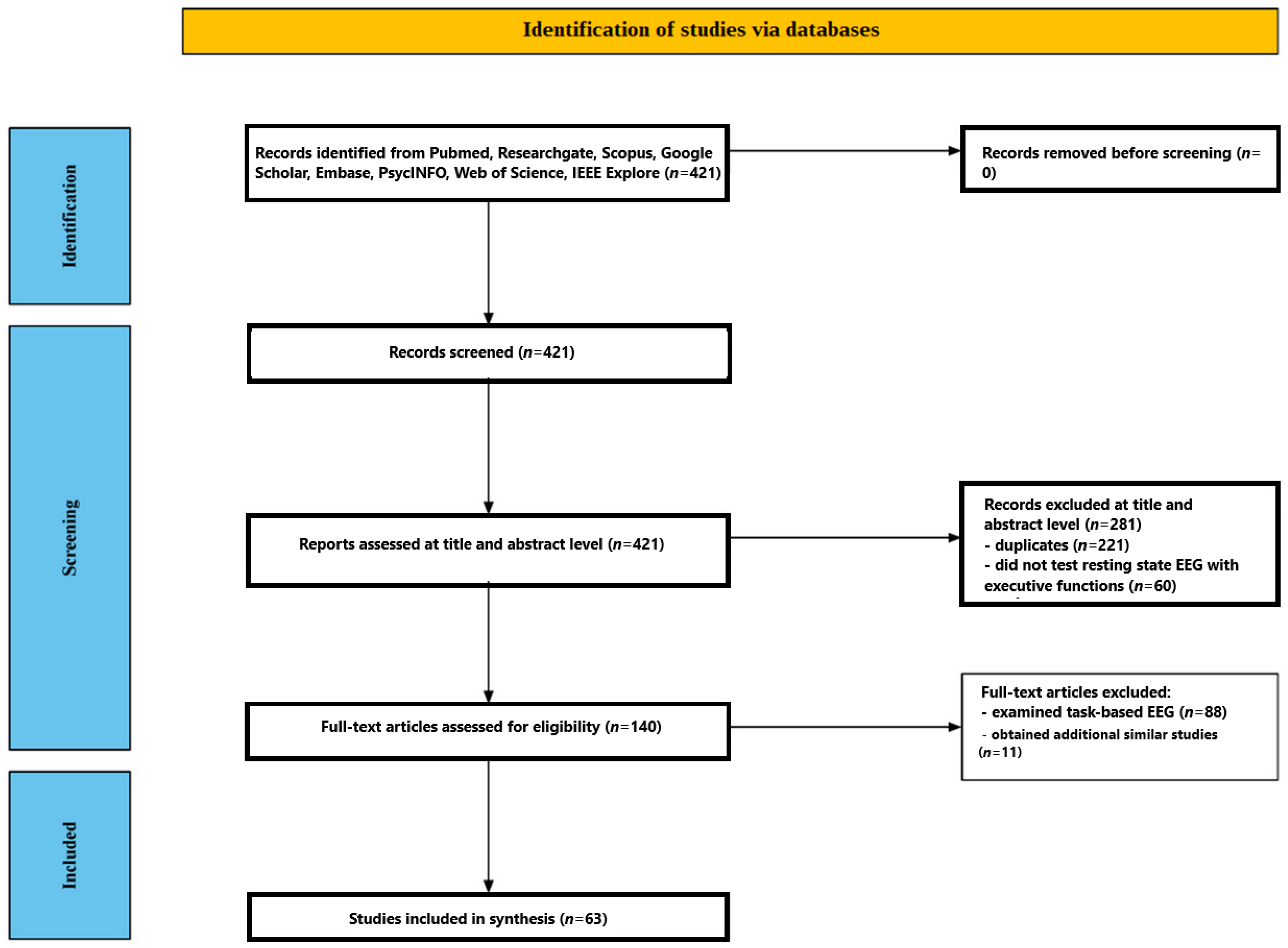 - Study designs. Observational cross-sectional or longitudinal cohorts, secondary analyses of open datasets, and experimental studies that correlated baseline (pre-task) resting EEG with later task performance. Case reports, reviews, tutorials, editorials, conference abstracts without full text, and studies without sufficient statistical information were excluded unless the authors could obtain data.