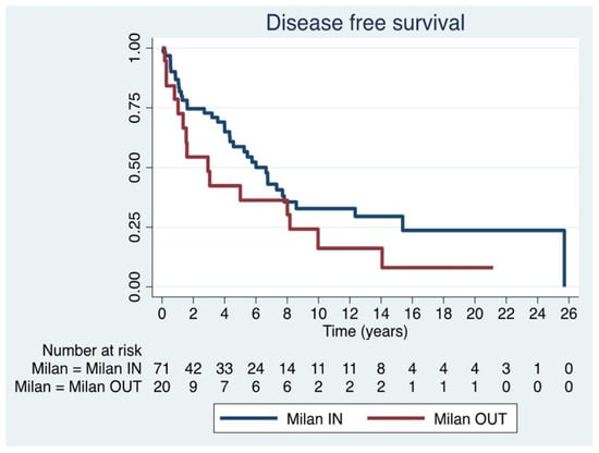 Given the heterogeneity of this historical series regarding adherence to Milan criteria, a sub-analysis was performed in Milan IN (n = 71) and OUT (n = 20) patients. The median DFS was 3.6 years (IQR 0.9–7.3) in the former group and 1.6 years (IQR 0.6–8.1) in the latter group, with no statistically significant difference between the two groups (p = 0.11) (Figure 3) (Table 4).