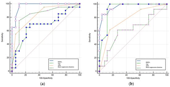 ROC analysis supported the predictive value of burst-suppression metrics. A BSR exceeding 15% and suppression duration over 6 min were associated with cognitive dysfunction at 24 h, while BSR values above 25% were associated with impairment at 48 h. ROC analyses demonstrated strong discriminative performance of burst-suppression metrics for early cognitive impairment; nevertheless, these thresholds should be considered hypothesis-generating and require external validation. Findings are summarized in Table 6 and Table 7 and illustrated in Figure 1a (24 h prediction) and Figure 1b (48 h prediction), with detailed numerical models provided in Tables S10 and S11 (Supplementary Material S2).