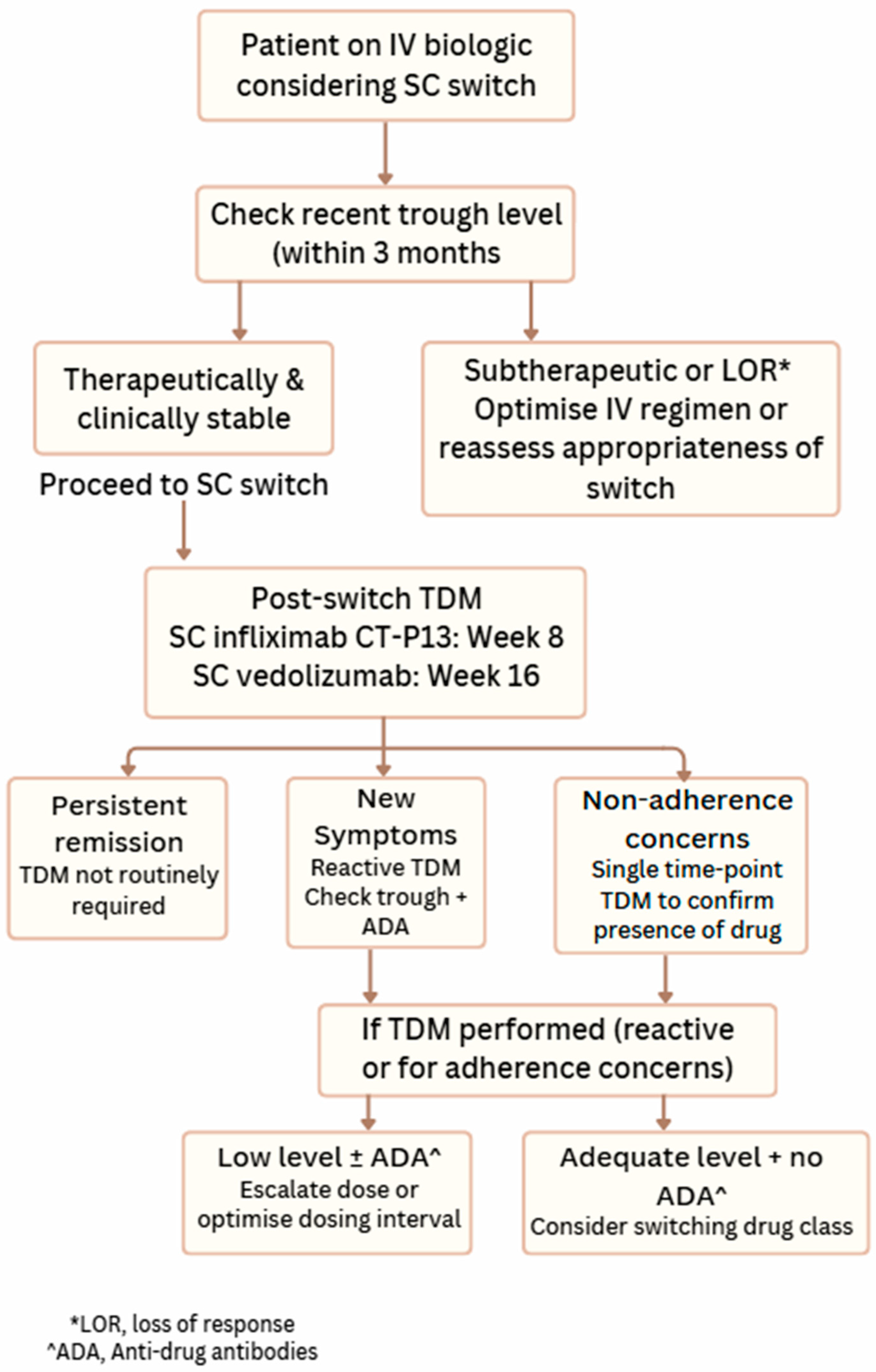 | Switching from IV to SC infliximab or vedolizumab | ✔ Consider baseline TDM to confirm adequate exposure | Helps establish pre-switch pharmacokinetic status |