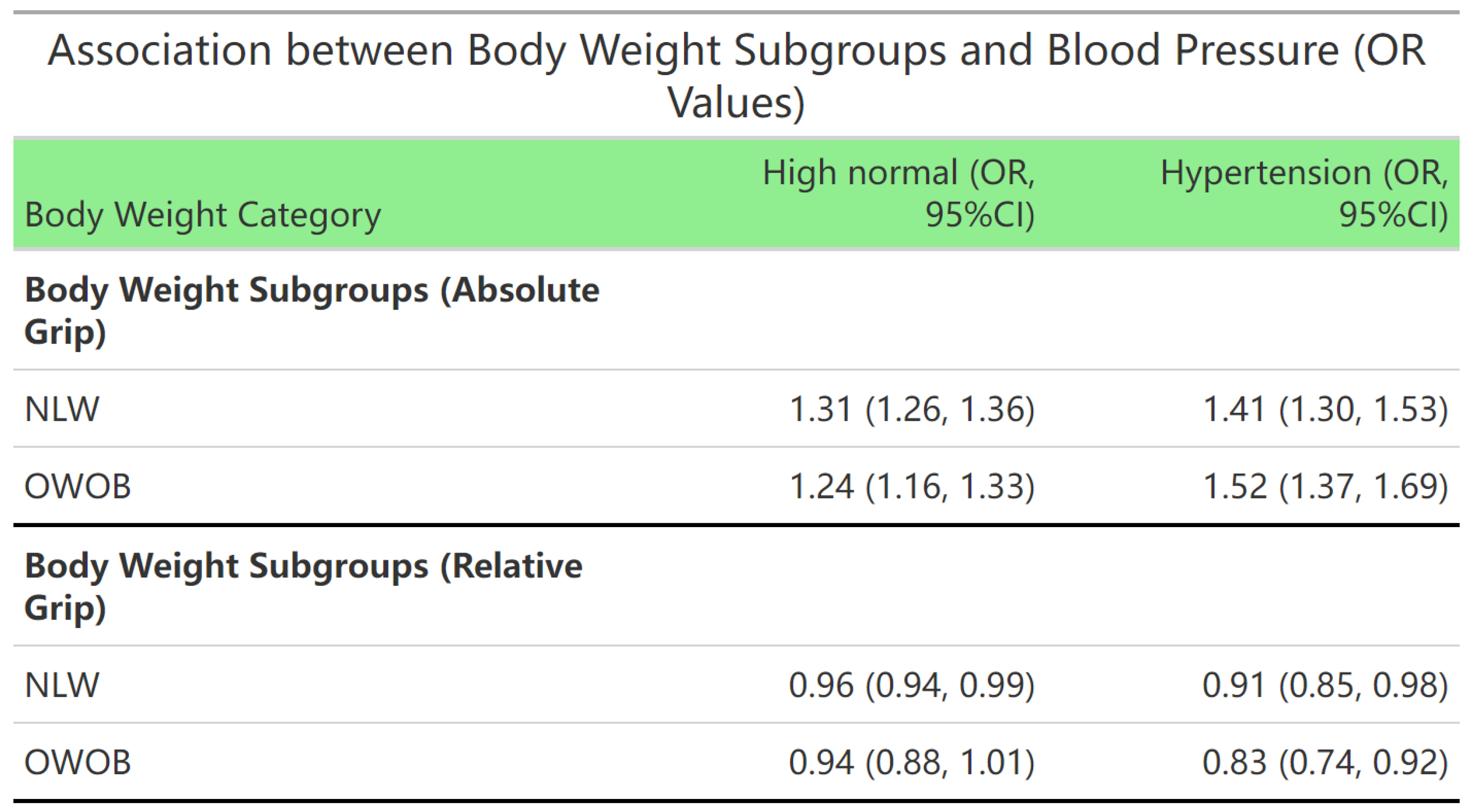 - Chon, D.; Shin, J.; Kim, J.H. Consideration of body mass index (BMI) in the association between hand grip strength and hypertension: Korean Longitudinal Study of Ageing (KLoSA). PLoS ONE 2020, 15, e0241360. [Google Scholar] [CrossRef]