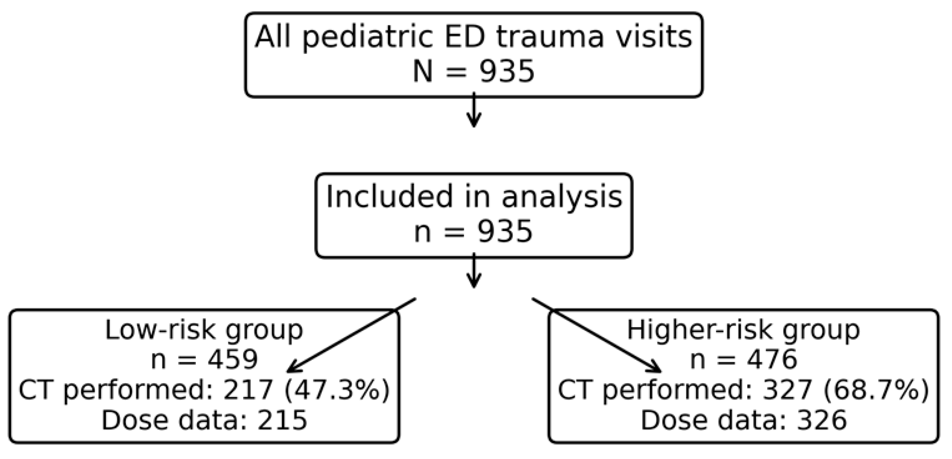 During the study period, 1648 pediatric trauma presentations were screened for eligibility. After excluding cases with missing key variables required for risk stratification, CT utilization, dose estimation, or ED disposition (n = 521), 1127 presentations remained. We then excluded patients with burn injuries (n = 192) a priori because their imaging pathways and radiation exposure profiles differed substantially from those of blunt/penetrating trauma, yielding a final analytic cohort of 935 patients.