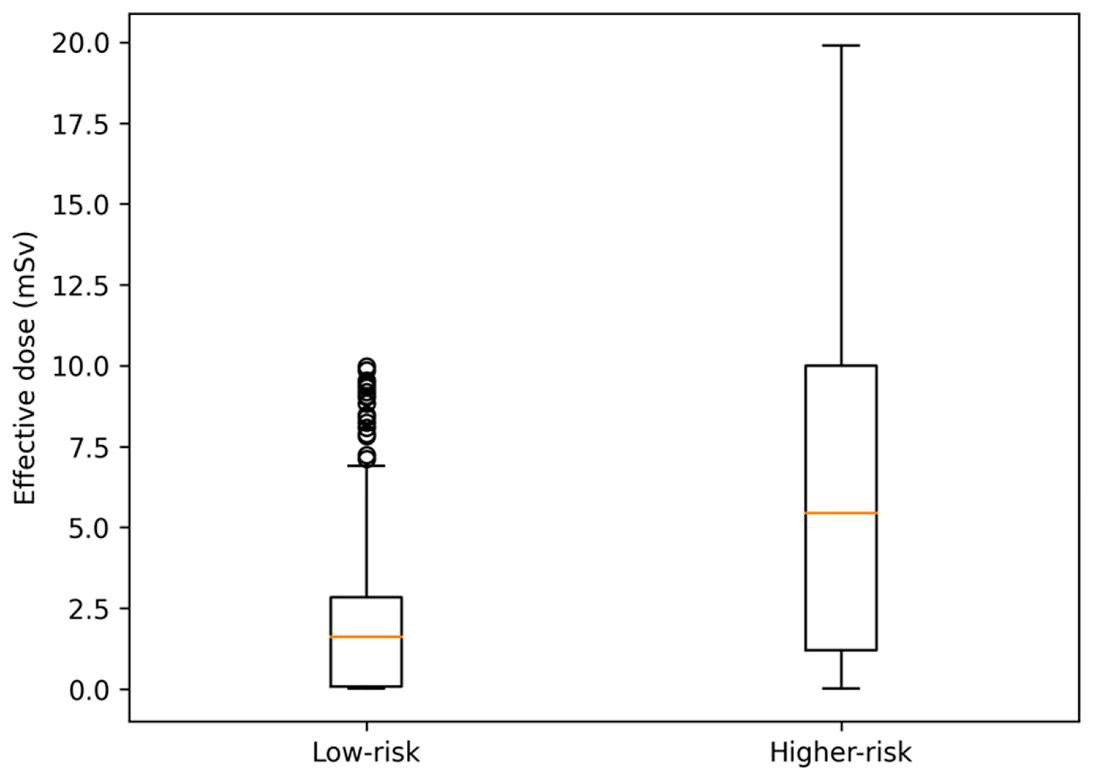 When examining the cumulative radiation burden, the total effective dose across all CT examinations with dose data was 2655.4 mSv; 1628.2 mSv (61.3%) accrued in the initial low-risk group and 1027.2 mSv (38.7%) in the higher-risk group, respectively.
