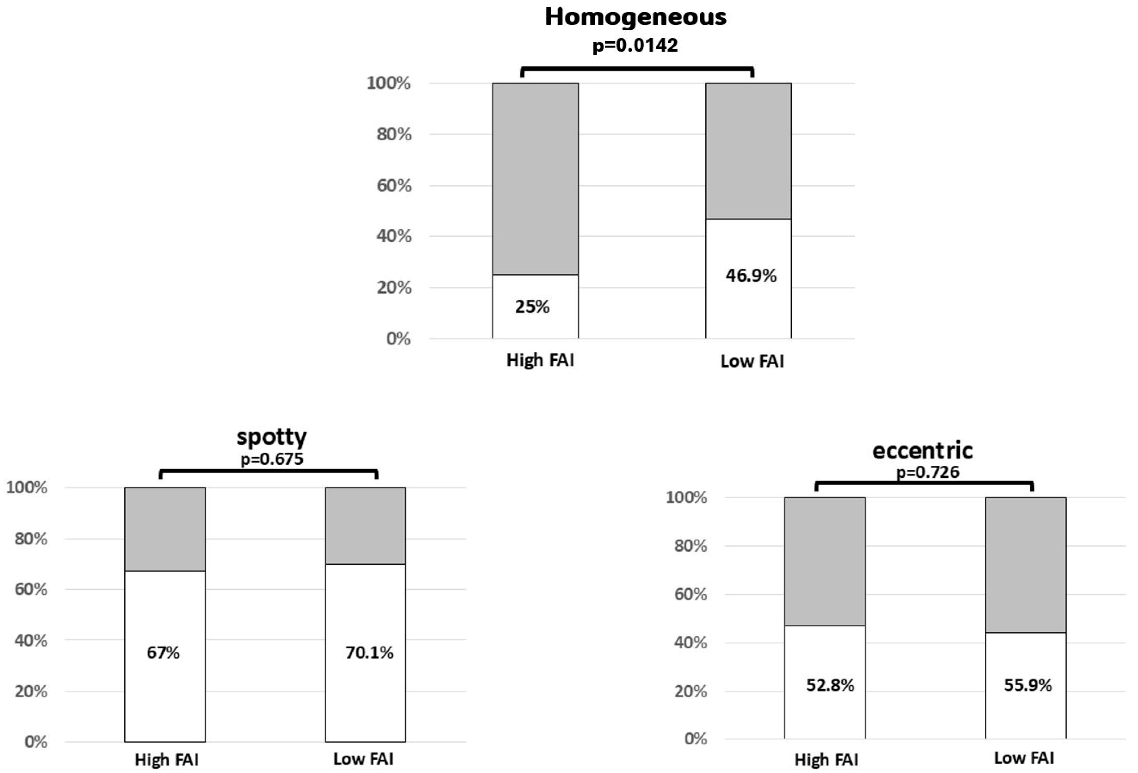 | Characteristics | Patients with High FAI Phenotype Lesions (n = 24) | Patients with Low FAI Phenotype Lesions (n = 160) | p-Value |