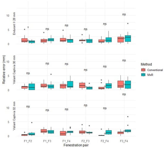 The median relative positional error (with IQR) for the conventional method ranged from 0.2 mm (0.2) to 1.8 mm (1.9) versus 0.5 mm (0.8) to 2.3 mm (2.2) for MxR. There were no statistically significant differences for any device, fenestration pairing, or method. Results are displayed in Table 2 and Figure 4.