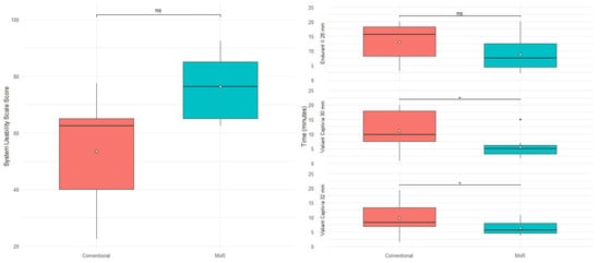 The conventional method achieved a median SUS score of 62.6 (25) versus 76.2 (20) of a maximum of 100 points with no statistically significant difference (p = 0.2). SUS results are shown in Table 4 and Figure 6.