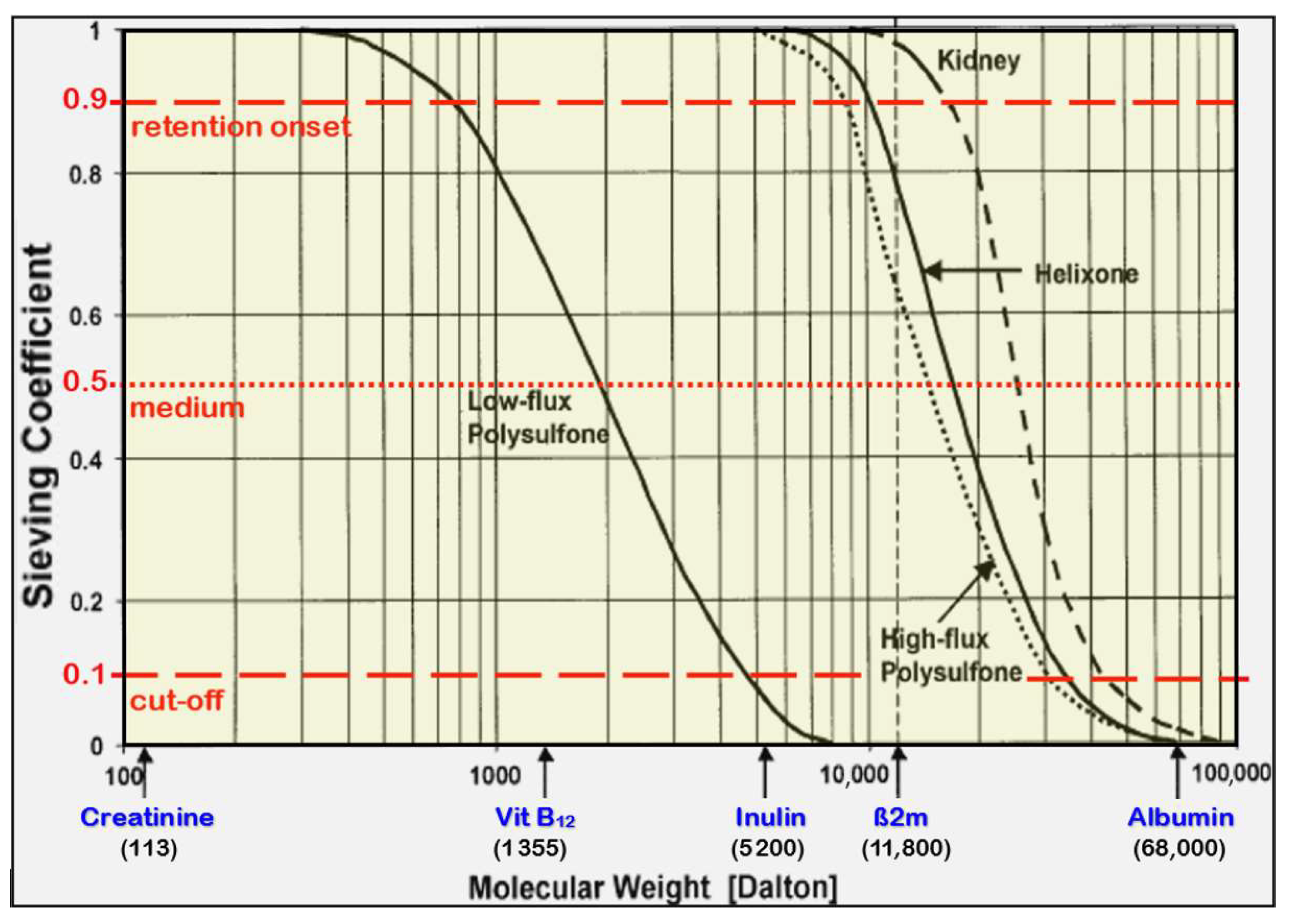 Sieving coefficients for the spectrum of relevant molecular substances give deeper insight into the elimination capacity for uremic solutes. Typically shown in semi-logarithmic graphs, the sieving coefficients of high flux membranes stay at a value of 1, or a probability of 100%, to cross the membrane for substances in the low molecular range. The molecular weight of proteins, whose sizes exceed the smallest pore sizes, marks the onset of the cut-off region onset (MWRO) at sieving coefficient S = 90% (10% retention). It starts in modern high-flux dialyzers at molecular masses of about 10 kDa or of ß