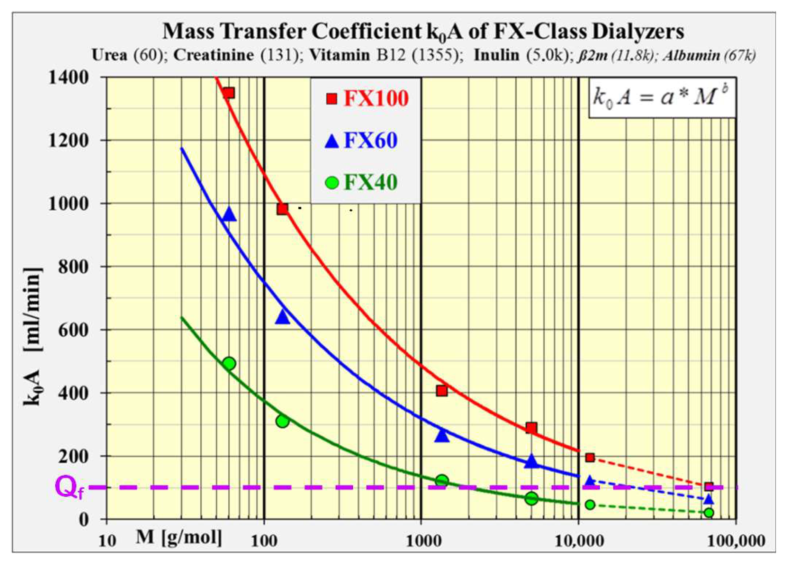 The mass transfer coefficient k0A of dialyzer membranes is usually experimentally determined, considering the number and actual geometry of the pores, and that diffusion in porous media is slower than in the bulk of the solvent.