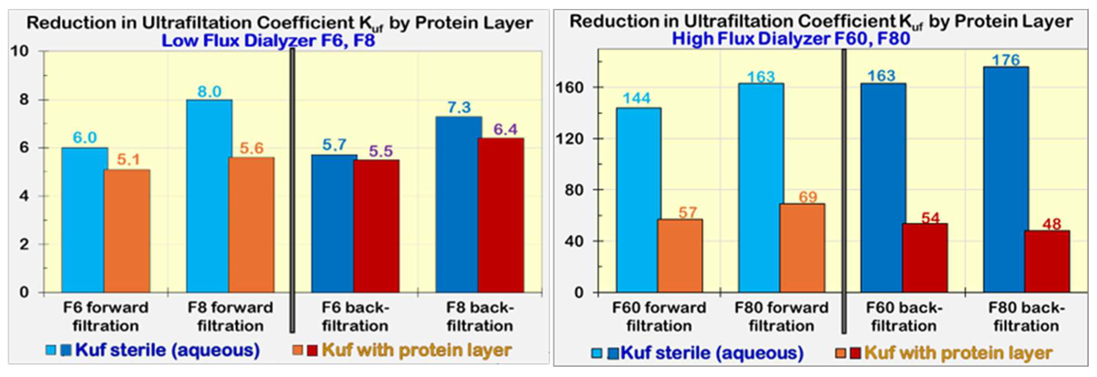 The total filtration flow rate across the dialyzer membrane, normalized for the applied transmembrane pressure, gives the ultrafiltration coefficient (KUF). It categorizes the membranes into low, medium, or high hydraulic permeability of water. However, the more relevant characteristic of low and middle molecular elimination performance cannot be derived from the KUF.