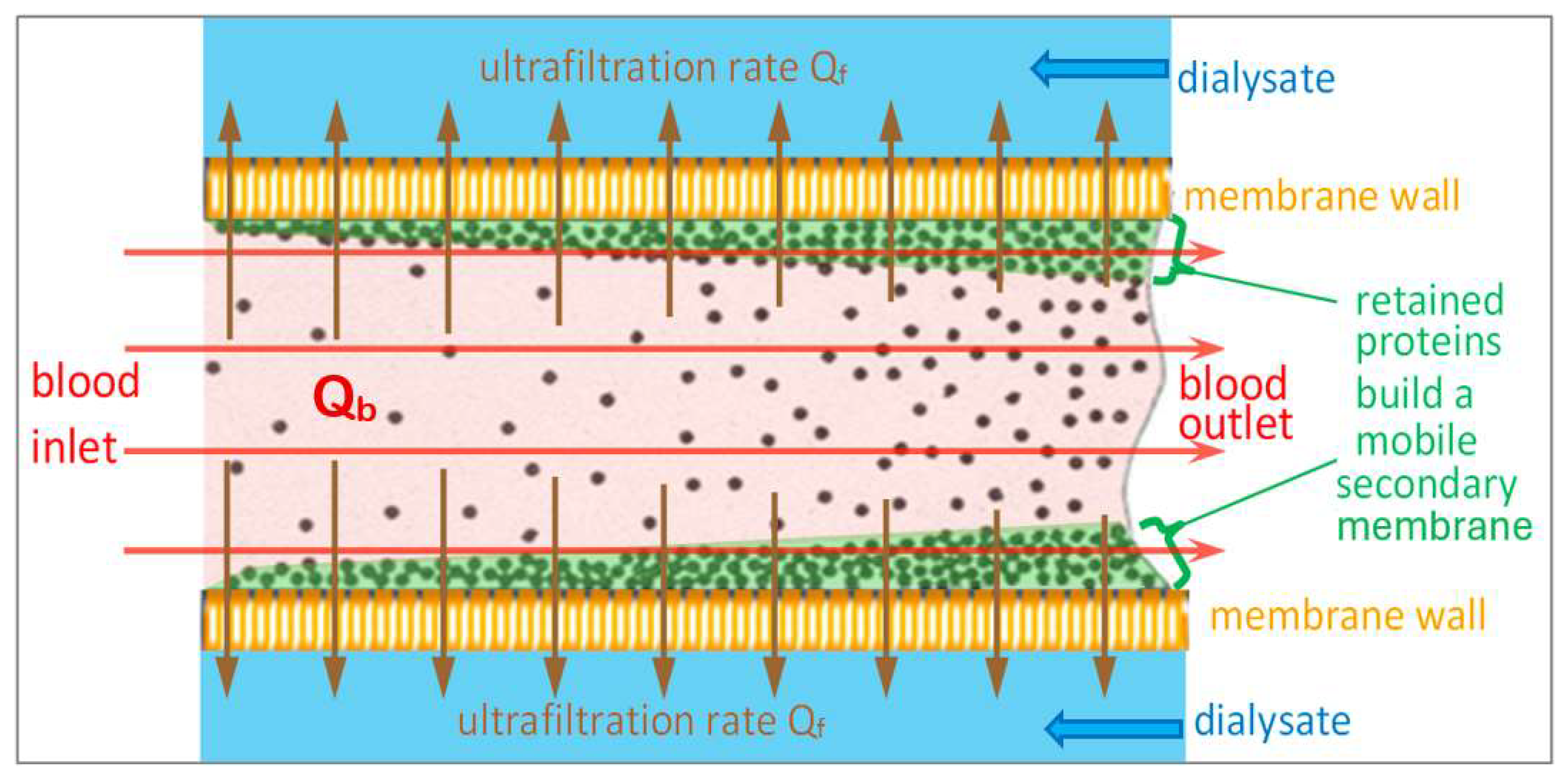 In all cases, it is essential to maintain a high blood flow rate to exert strong shear stress on the membrane. This shear stress effectively “scrubs” the membrane, reducing the thickness of the protein layer and preventing excessive protein polarization.