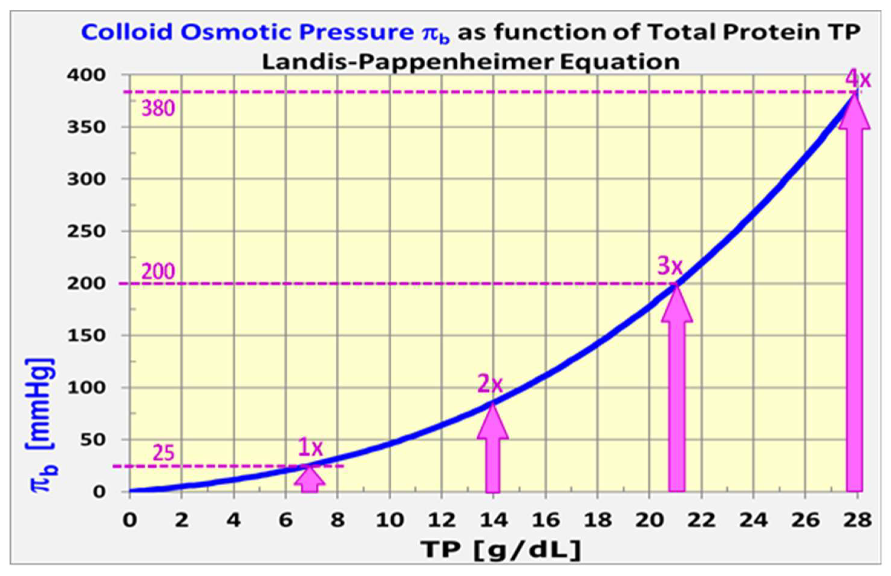 The high protein concentration on the membrane surface causes remarkably high oncotic pressure. It generates an osmotic flow from dialysate into the blood, which is several times higher than the substitution and weight-loss flow rates together, but it carries no solutes. The hydraulic pressure difference TMP pushes the equal flow rate back into the hydraulic to balance the fluid volumes. That directed flow rate transports solutes, enhancing the convective clearance.