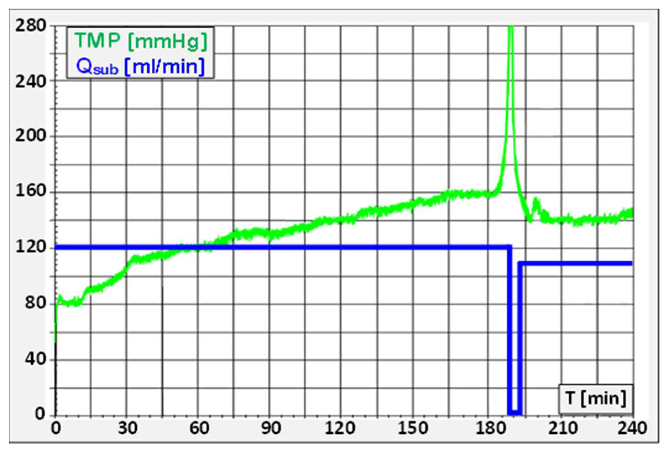 Qf is reduced from initially 130 mL/min to 105 mL/min during the treatment. This more conservative mode prevents excessively high TMPs at the end of the treatment in all cases, which can cause additional severe albumin losses in this treatment phase.