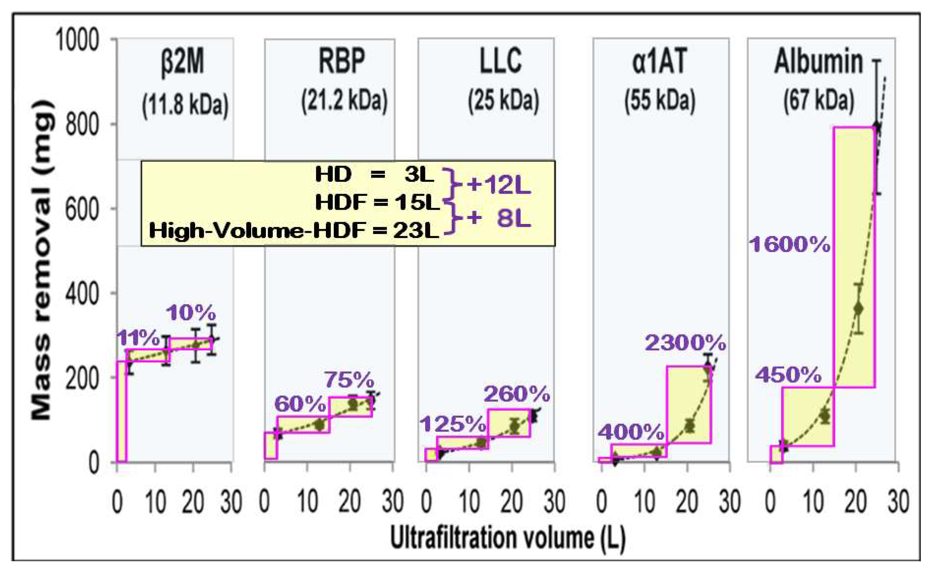 β2m > 0.8), effective removal now extends to smaller middle molecules in the range of approximately 10–12 kDa. The incremental gain in mass removal when transitioning from HD to HDF, and subsequently to high-volume HDF, is therefore primarily observed within this molecular domain. For example, β
