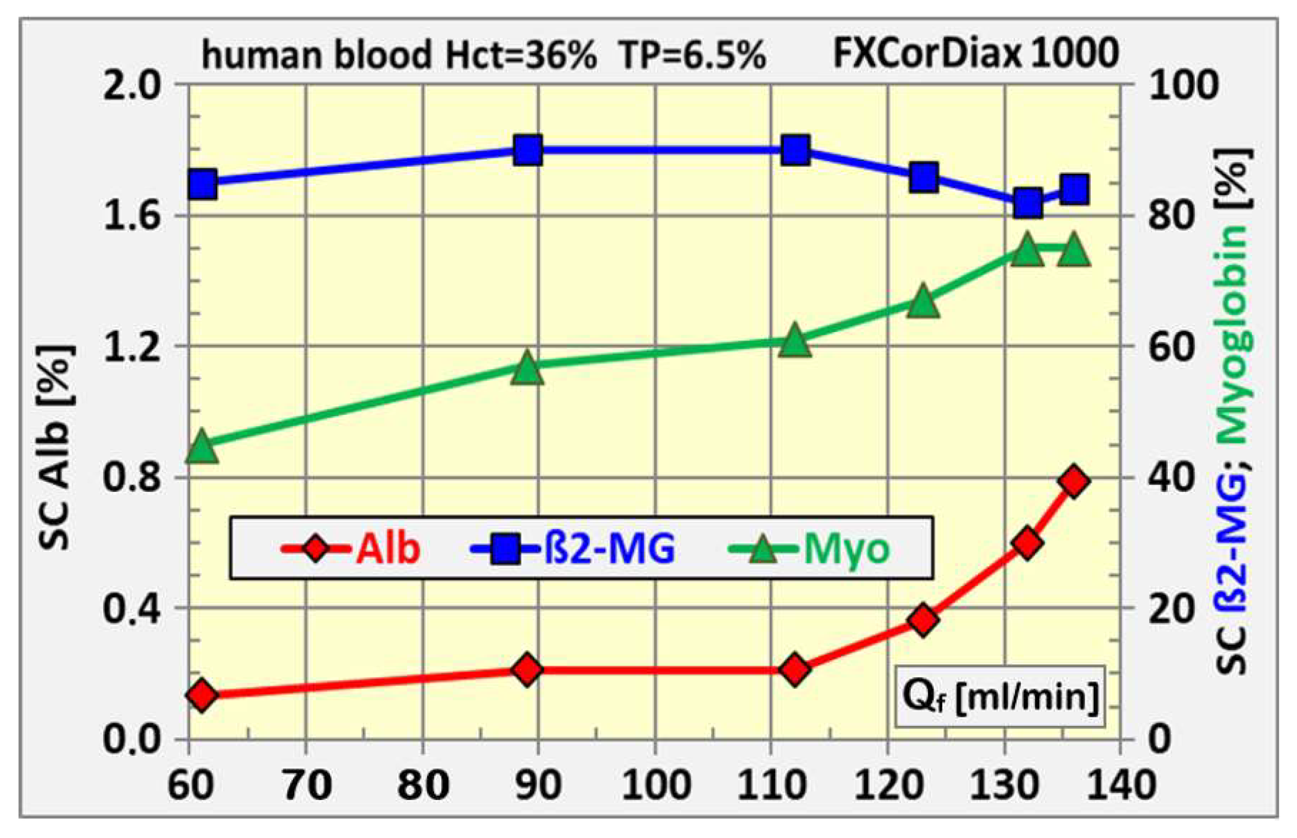 22]. In addition, internal filtration depends strongly on blood flow, hemorheological conditions, and blood flow resistance, making it highly dependent on operational conditions. Furthermore, the MCO dialyzer functions as a “black box” with no meaningful or sample method to verify that the prescribed convective dose has actually been delivered, in contrast with online HDF.