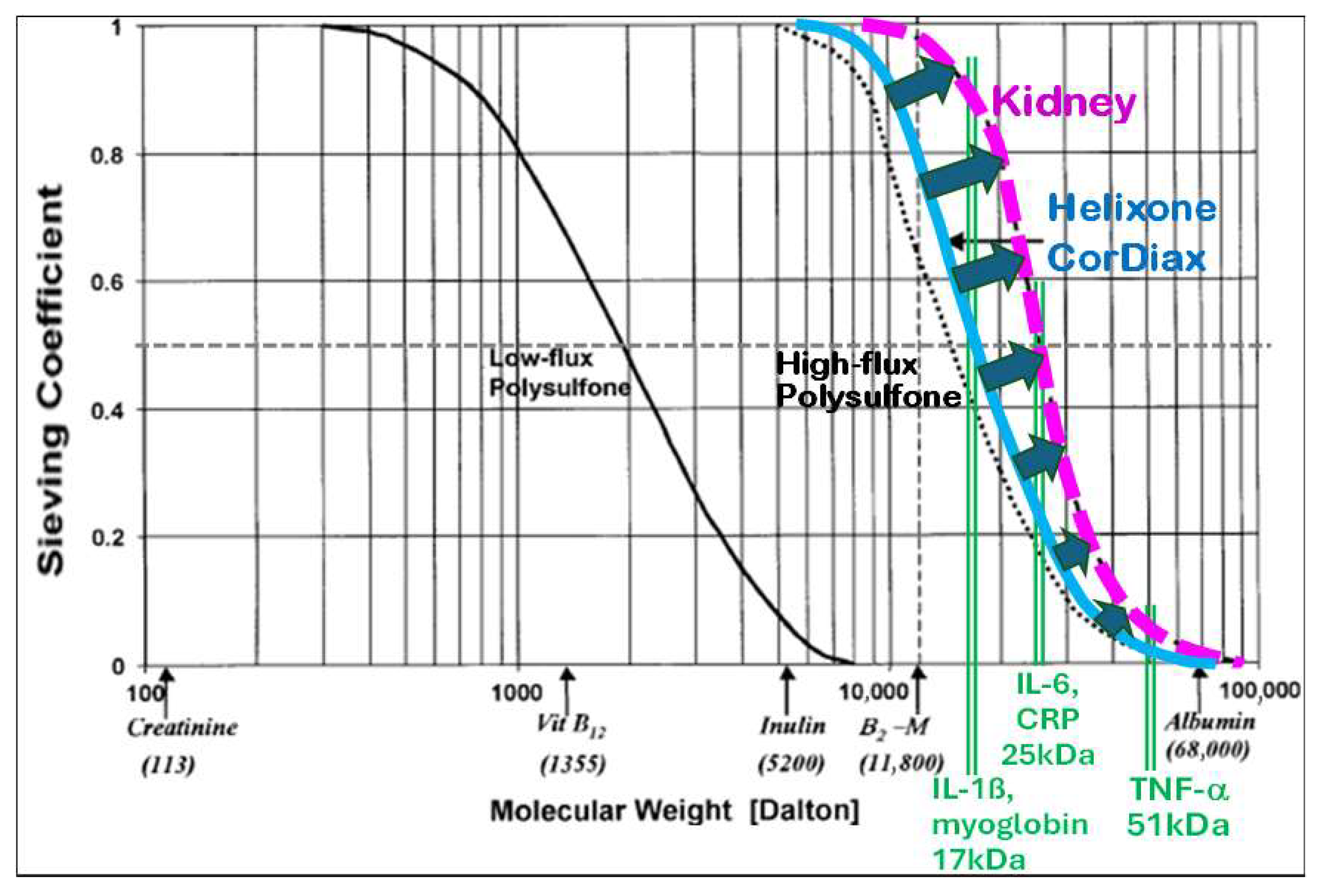 Beyond 60.000 Da, typically the size of albumin (HSA, 67 kDa), the sieving coefficients reach values below one percent to limit the loss of albumin and other large proteins, especially under hemodiafiltration conditions. The sieving characteristic is adjusted to that of healthy kidneys in this molecular range.
