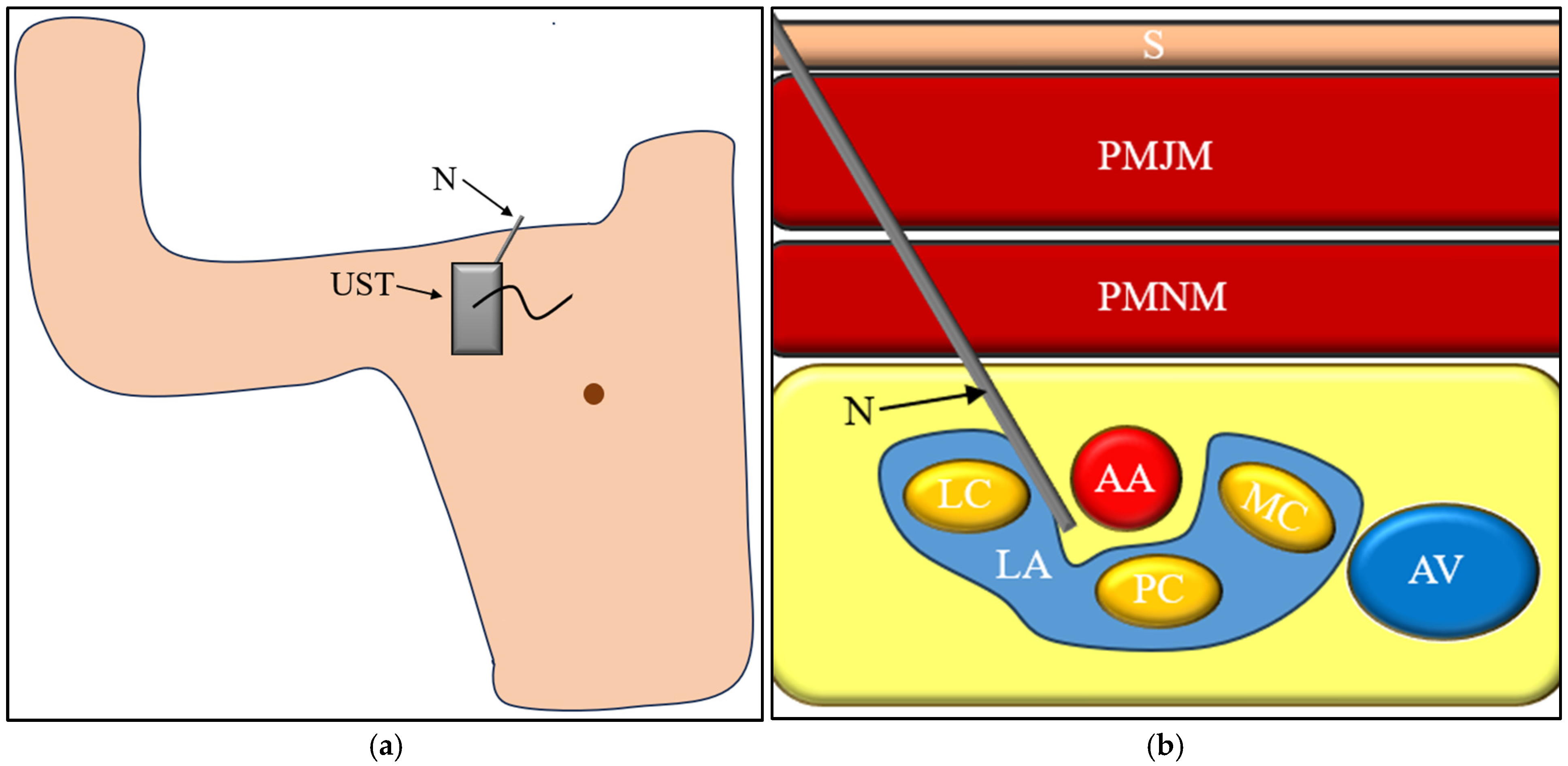 - Diwan, S.; Feigl, G.; Nair, A. Ultrasound-guided single needle tip placement below axillary artery in the infraclavicular area: A cadaveric study. J. Anaesthesiol. Clin. Pharmacol. 2022, 38, 658–661. [Google Scholar] [CrossRef]