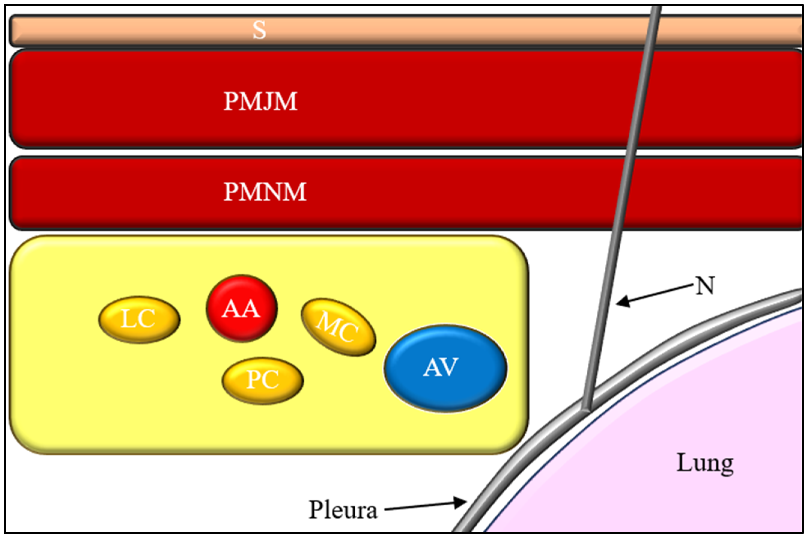 | Pneumothorax | Classically associated with vertical approaches (Neuburger 2000 [42]) | Rare but reported | Rare; reported despite US (Gauss 2014 [43]); usually linked to loss of needle tip visualization |