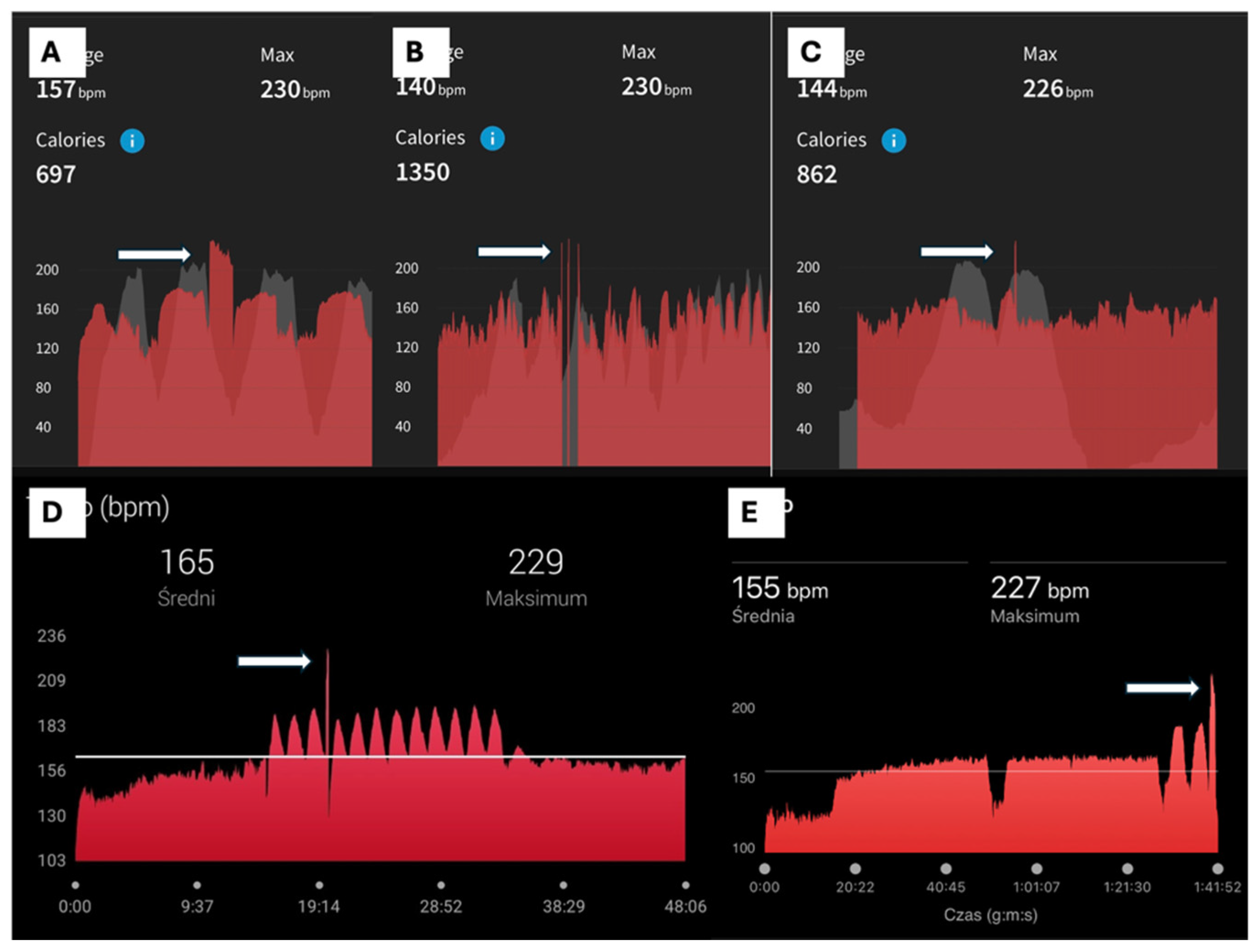 Maximal heart rate during arrhythmic episodes ranged from 205 to 240 bpm, clearly exceeding age-predicted maximal heart rates. Most arrhythmias were detected exclusively using chest-strap heart rate (HR) monitors. In one case, wrist-based photoplethysmography (PPG) was used, and in two cases the heart rate increase was supported by single-lead ECG recordings from smartwatches (