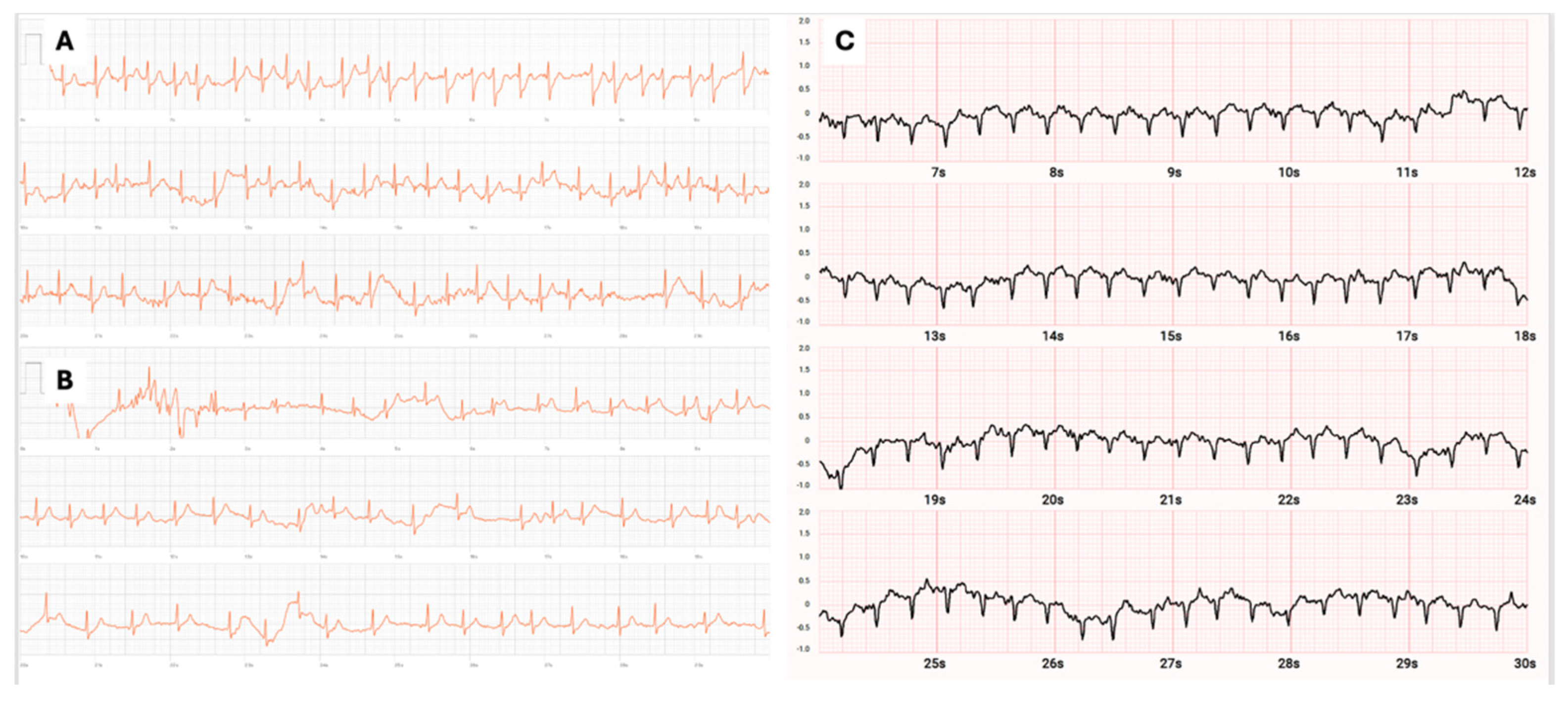 - Saggu, D.K.; Udigala, M.N.; Sarkar, S.; Sathiyamoorthy, A.; Dash, S.; Mohan, P.V.R.; Rajan, V.; Calambur, N. Feasibility of using chest strap and dry electrode system for longer term cardiac arrhythmia monitoring: Results from a pilot observational study. Indian Pacing Electrophysiol. J. 2024, 24, 282–290. [Google Scholar] [CrossRef] [PubMed]