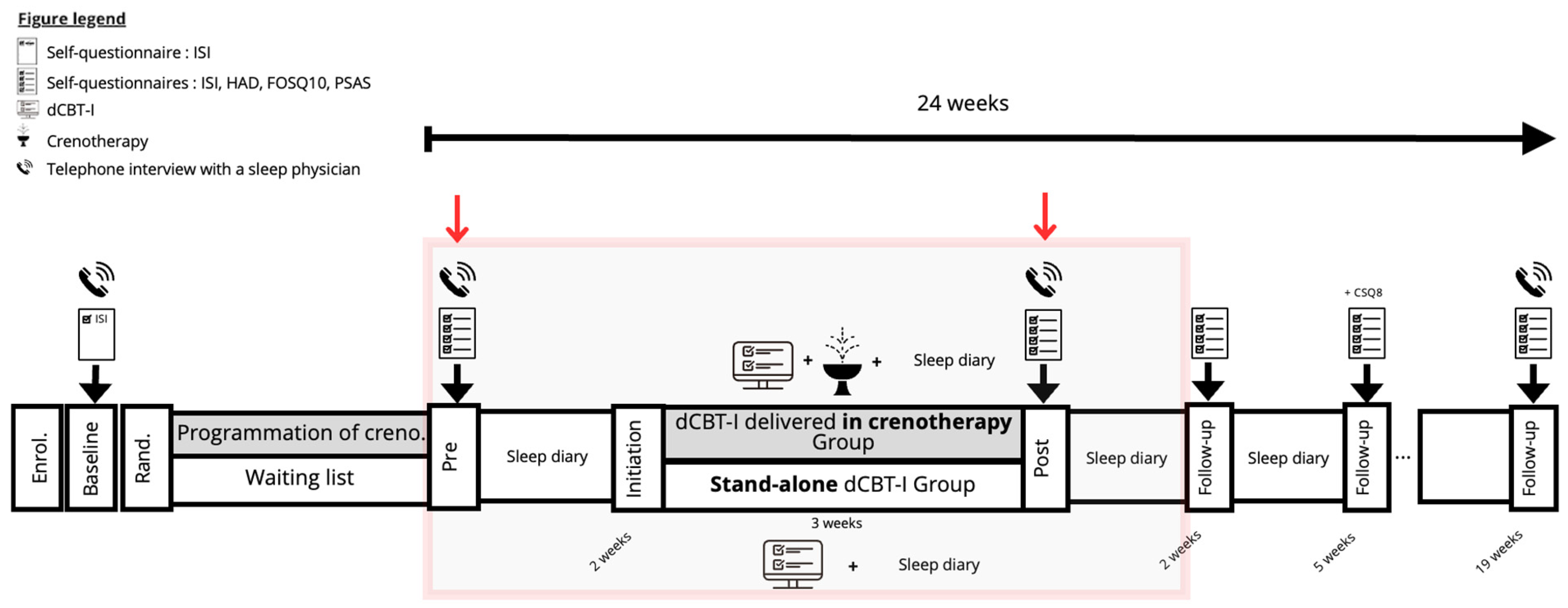 | Pre-treatment period (W0–W2) | ISI, secondary outcomes and 2 weeks sleep diary | ISI, secondary outcomes and 2 weeks sleep diary | Home |