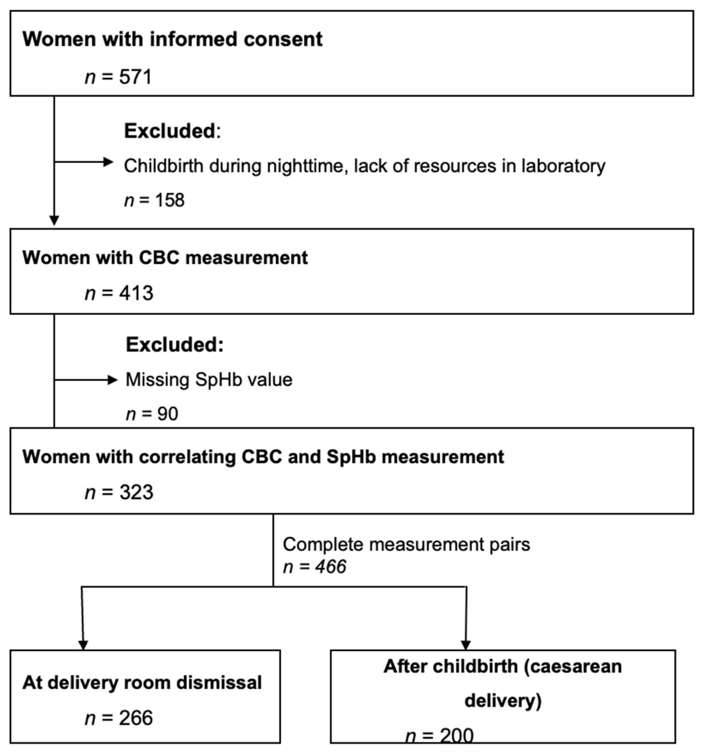 - Mills, K.; Vermeer, J.M.; Berry, W.E.; Karreman, E.; Lett, C.D. Determining the validity of non-invasive spot-check hemoglobin co-oximetry testing to detect anemia in postpartum women at a tertiary care centre, a prospective cohort study. BMC Pregnancy Childbirth 2023, 23, 479. [Google Scholar] [CrossRef] [PubMed] [PubMed Central]