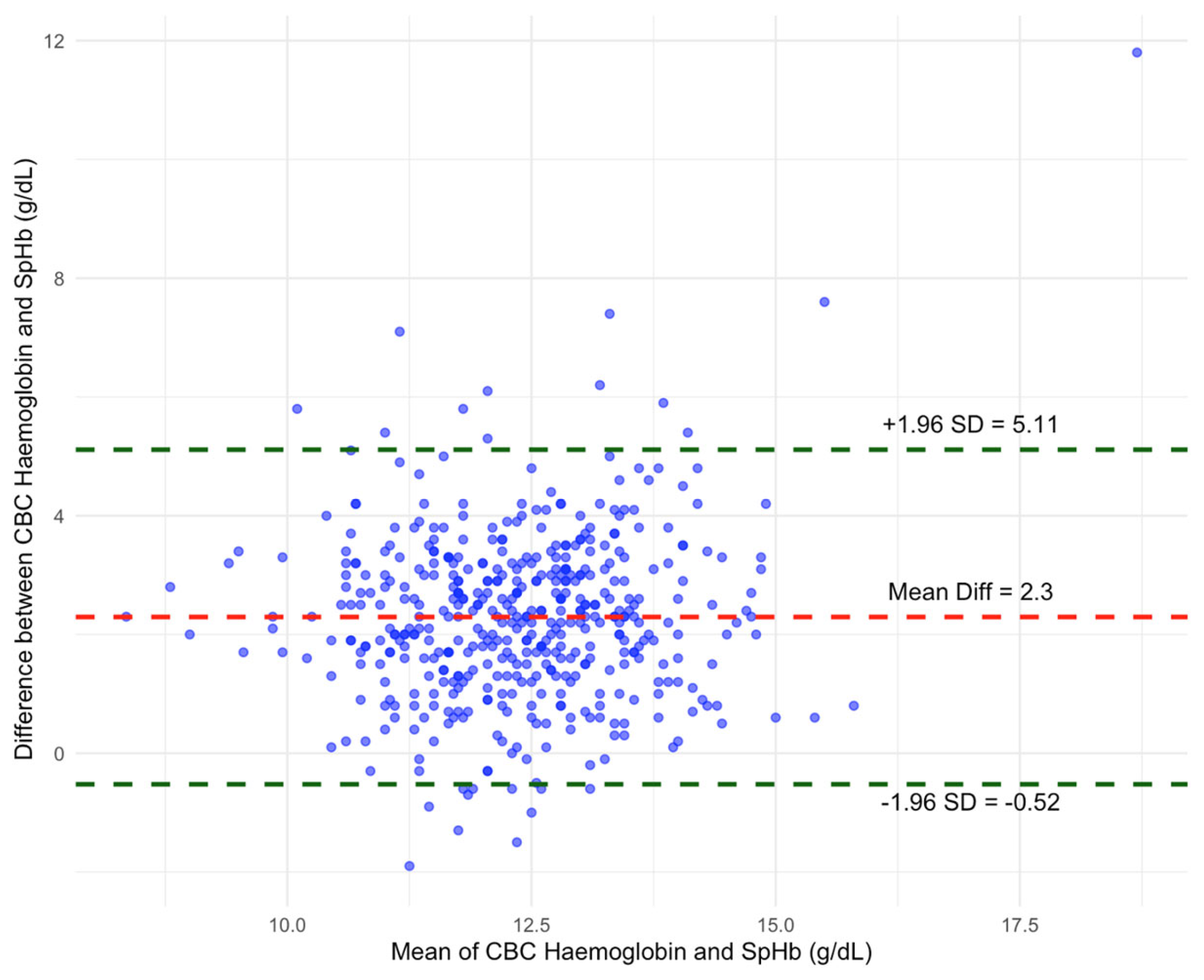 | Mean difference SpHb-CBC | 2.3 | 1.44 |