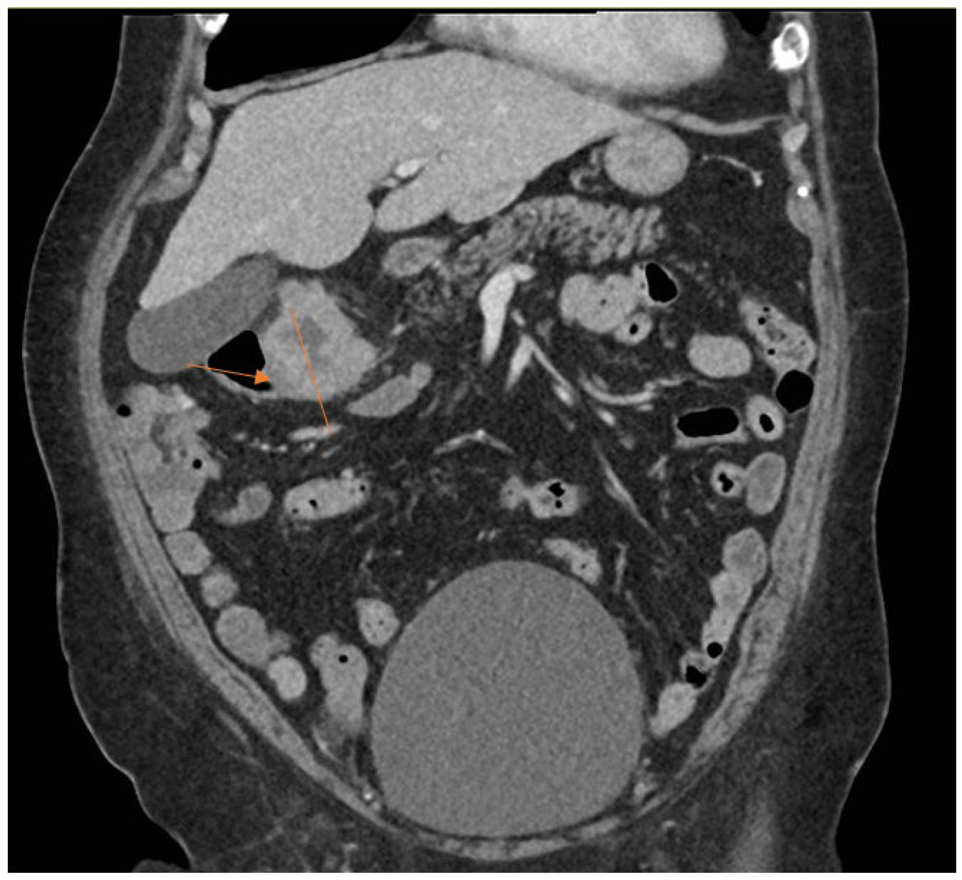 The patient is a 77-year-old lady who has a past medical history of hypertension, hyperlipidemia and left breast invasive ductal carcinoma of which she underwent a simple mastectomy with axillary clearance in 2019. She had her left total knee arthroplasty done in 2008 and right total knee arthroplasty done in 2010. She was seen in the clinic 15 years after her right total knee arthroplasty for worsening left knee pain that worsened on ambulation. She was unable to ambulate and extend her knee actively. Her inflammatory markers were raised; CRP at 115 mg/L and ESR at 73 mm/h, respectively. Bedside aspiration of her left knee was performed under aseptic conditions, showing Morganella morganii (M. morganii). The culture was resistant to ampicillin and amoxicillin/clavulanic acid. She was thereafter admitted for late-onset M. morganii left knee PJI. The Infectious Diseases team suggested a CT-AP prior to revision surgery to rule out intra-abdominal sources of hematogenous seeding. CT-AP subsequently revealed a suspicious proximal transverse colon mass with lymphadenopathy.