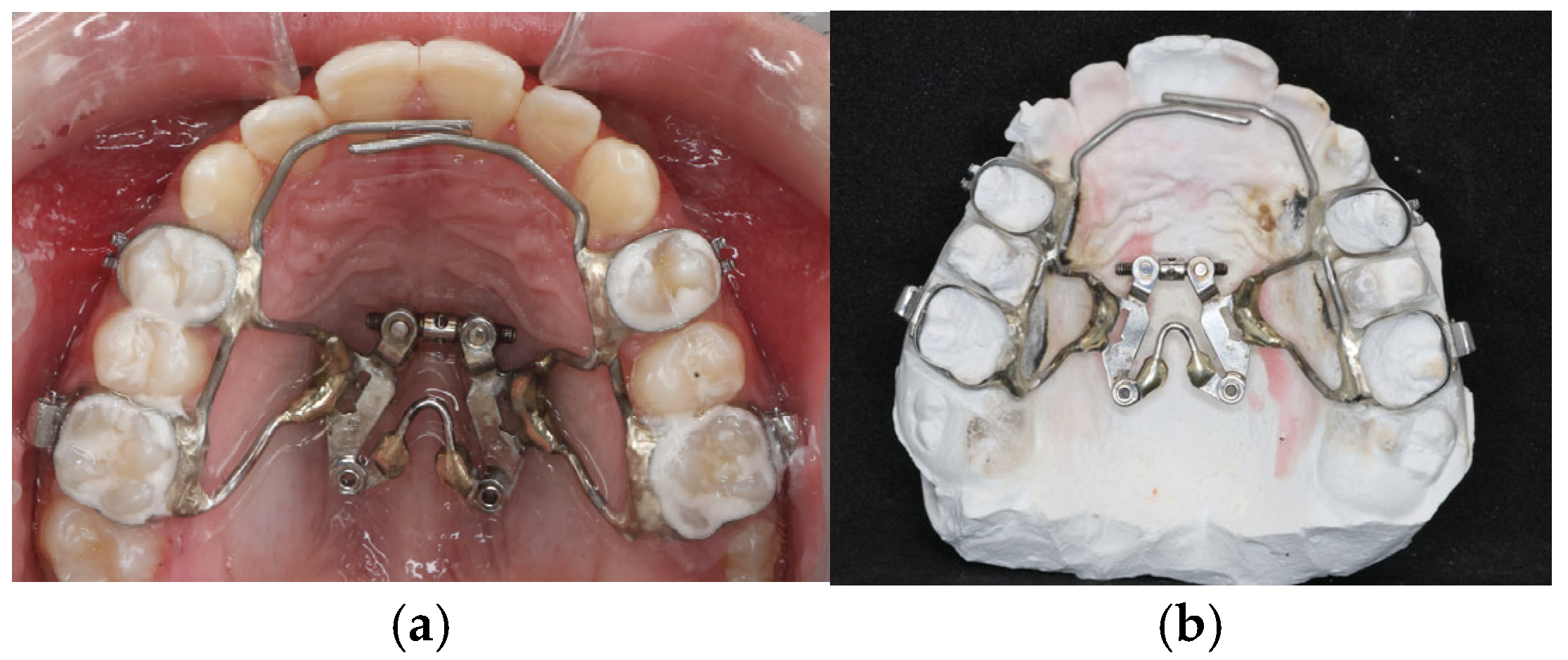 - Carlson, C.; Sung, J.; McComb, R.W.; Machado, A.W.; Moon, W. Microimplant-assisted rapid palatal expansion appliance. Am. J. Orthod. Dentofac. Orthop. 2016, 149, 716–728. [Google Scholar] [CrossRef]